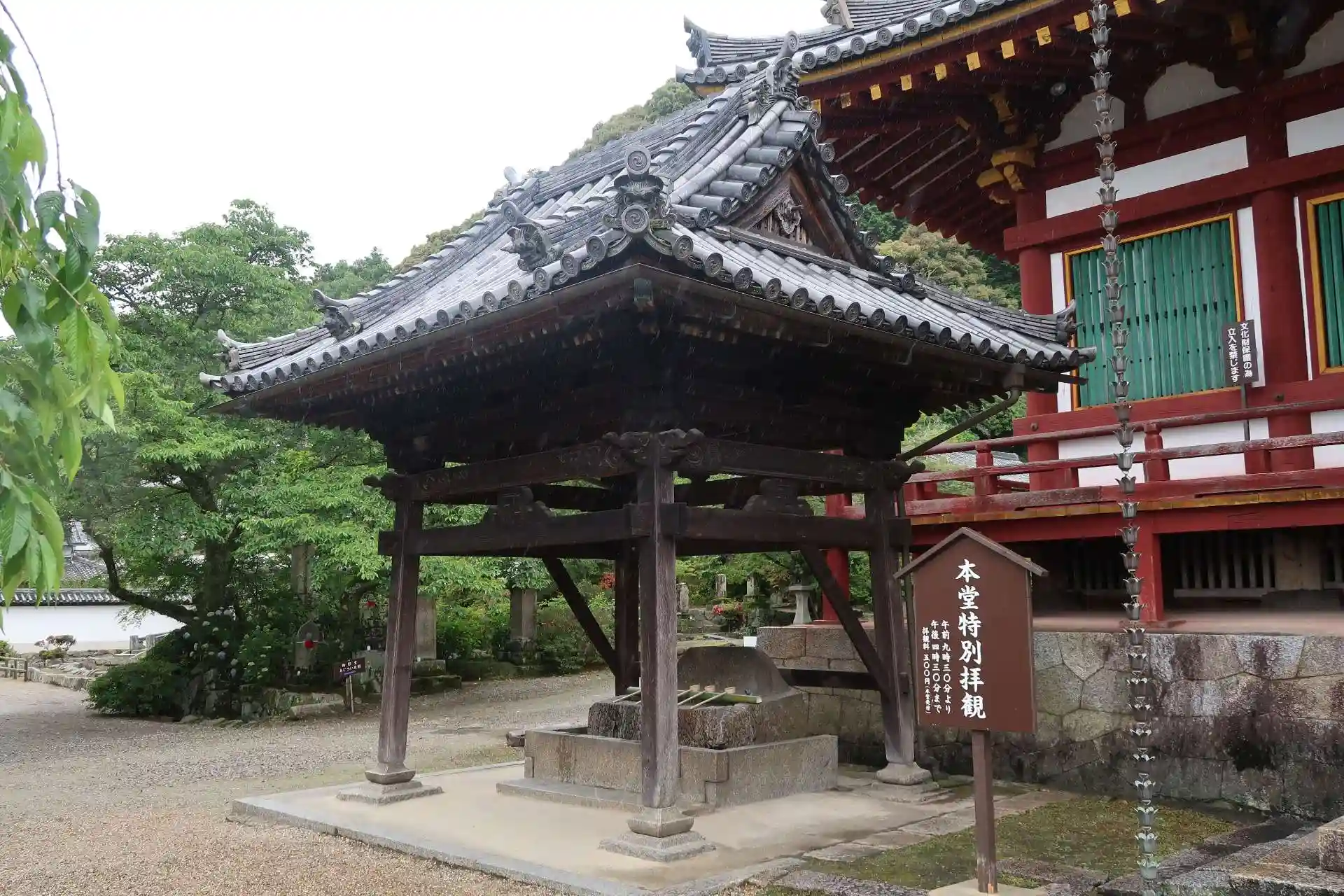 本堂への石段手前の右側に講堂、その奥に春日神社。左側にはあじさい庭園、後から行きます。少しの石段を上がって本堂。右側に鐘楼、その奥に北僧坊(塔頭)。左側に手水、この先に南僧坊(塔頭)。
