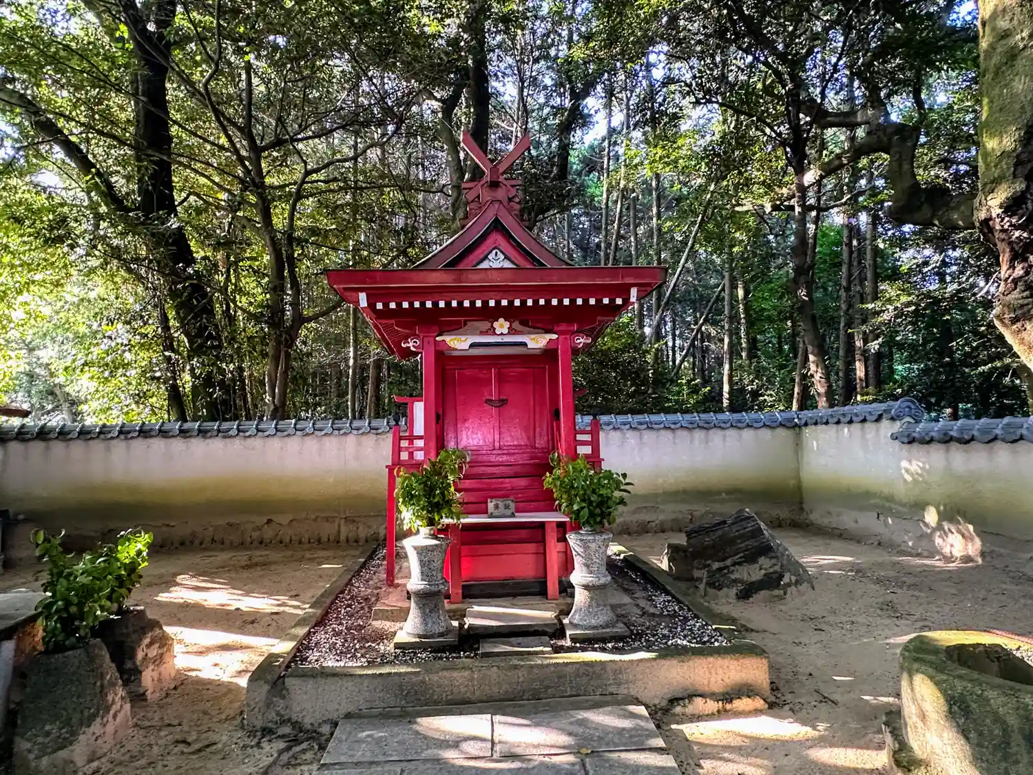 少し山に向かって進んだところに、小さな赤い社の神社がありました。