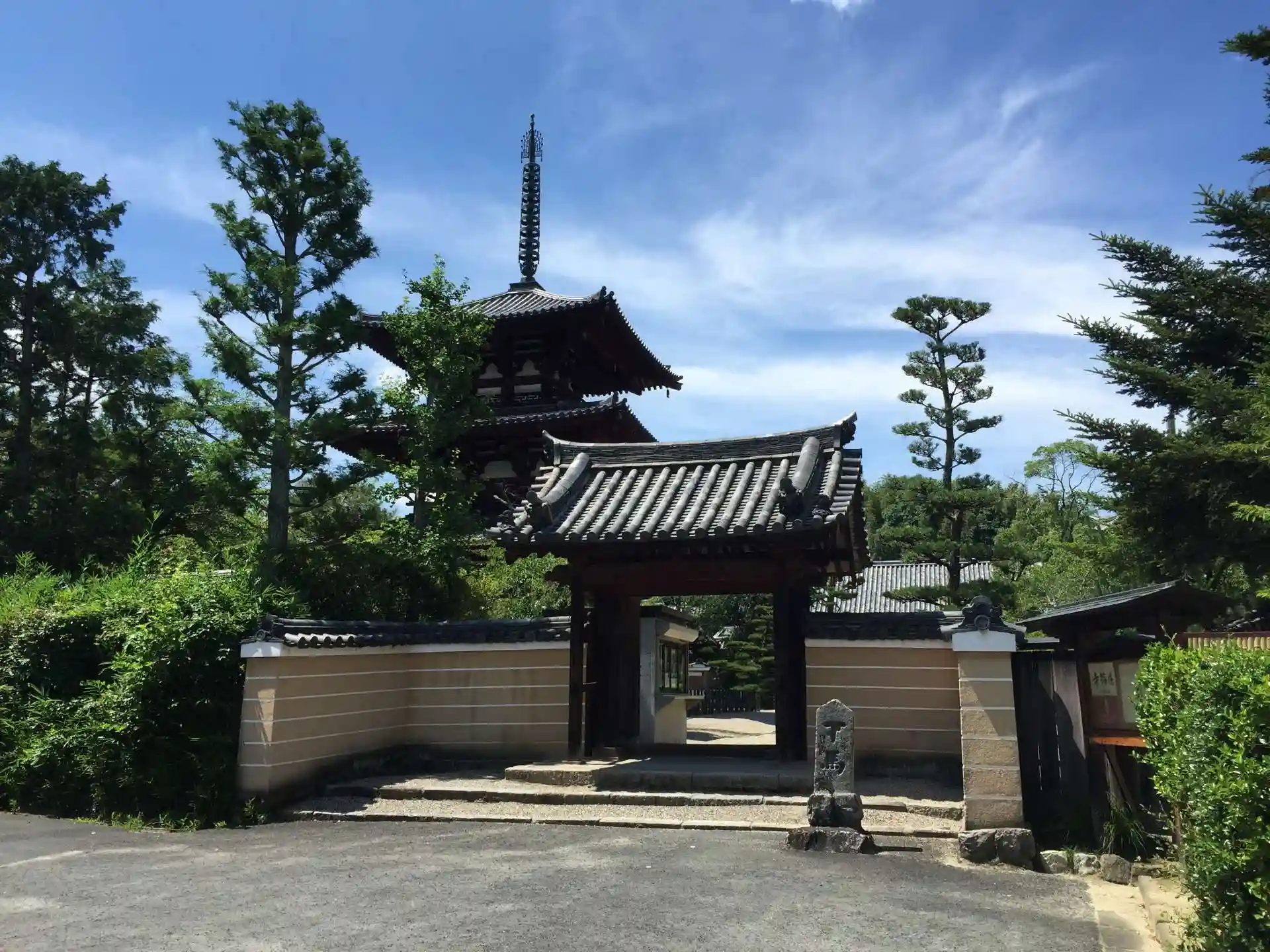 法隆寺、法起寺の塔とともに斑鳩三塔と呼ばれる塔があると言う事に興味を持ち、中宮寺の後に参拝。中宮寺から徒歩で30分程かかった。