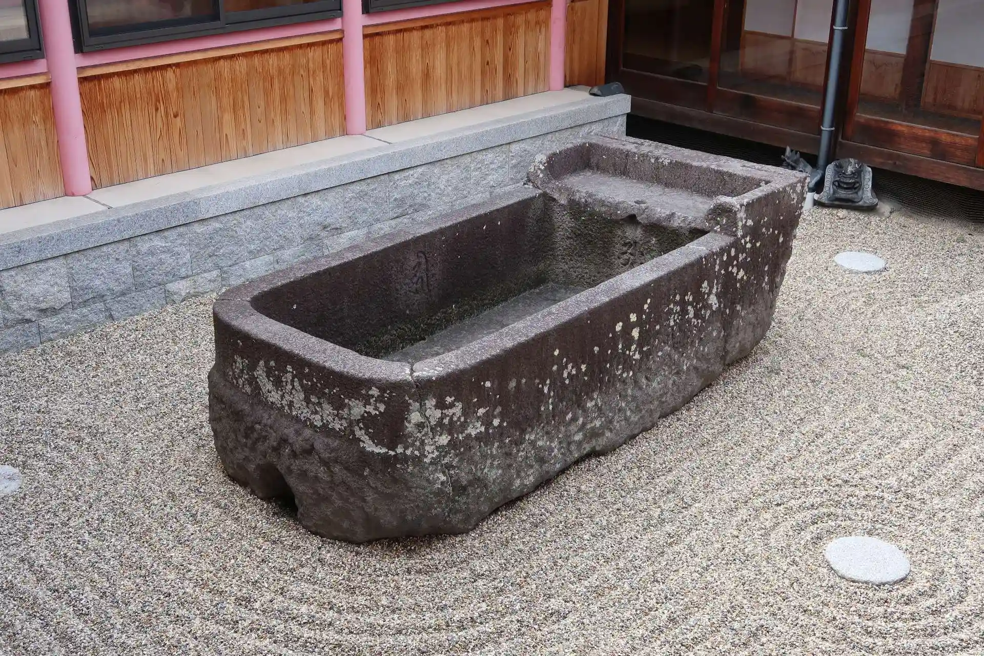 本堂への渡り廊下の中庭に大きな石風呂が置かれていました。(パッと見、石棺?と思いました。)