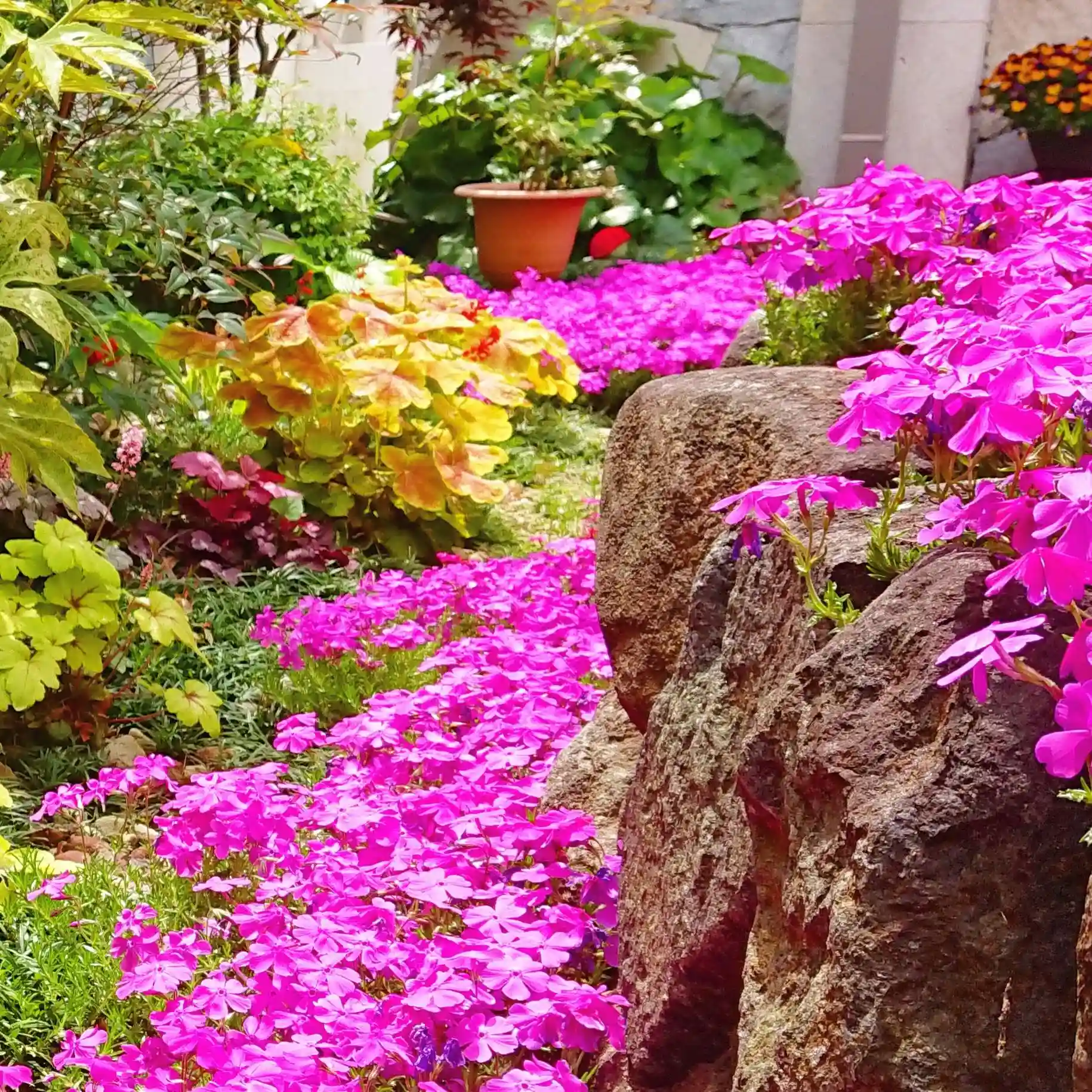 半日陰の場所でもヒューケラや芝桜が元気に育っております🌸🌿