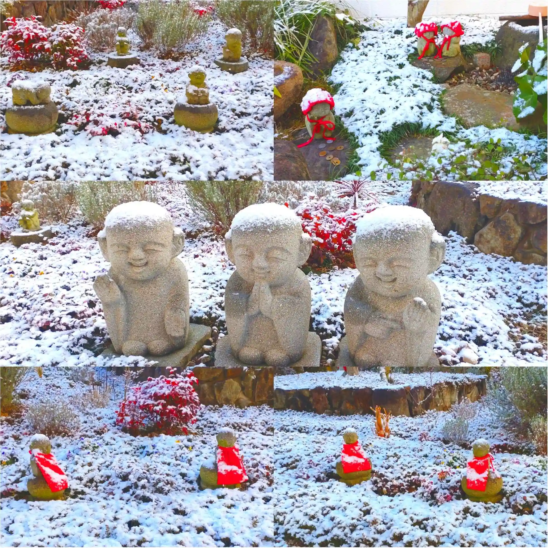 積雪の朝を迎え雪帽子のわらべ地蔵様に🤗❄