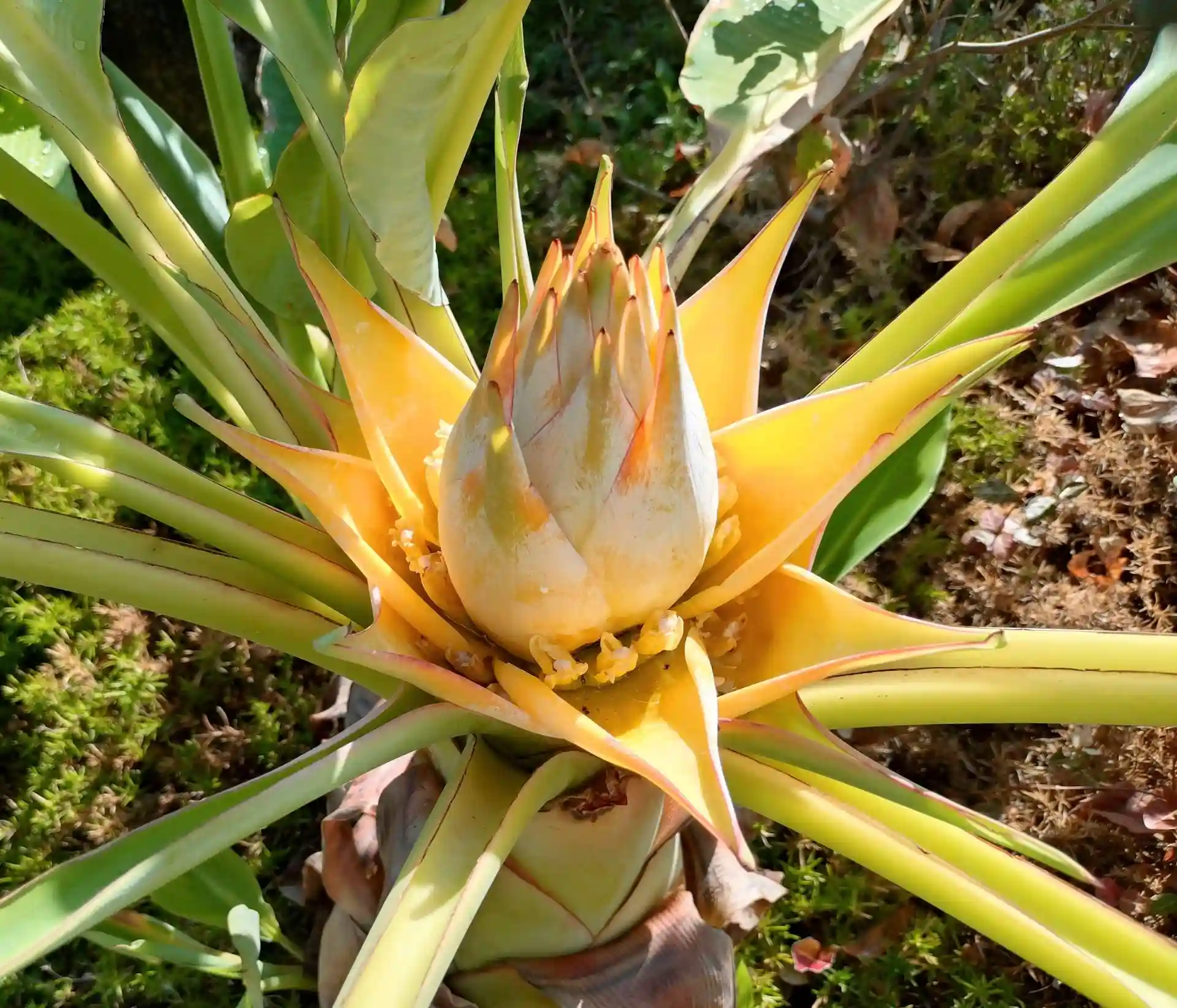 地面から蓮に似た黄金色の花が湧き出てきます。花径は約30cmで花びらのように開いているのは苞とよばれる葉で、中にある小さな筒が花です🌼