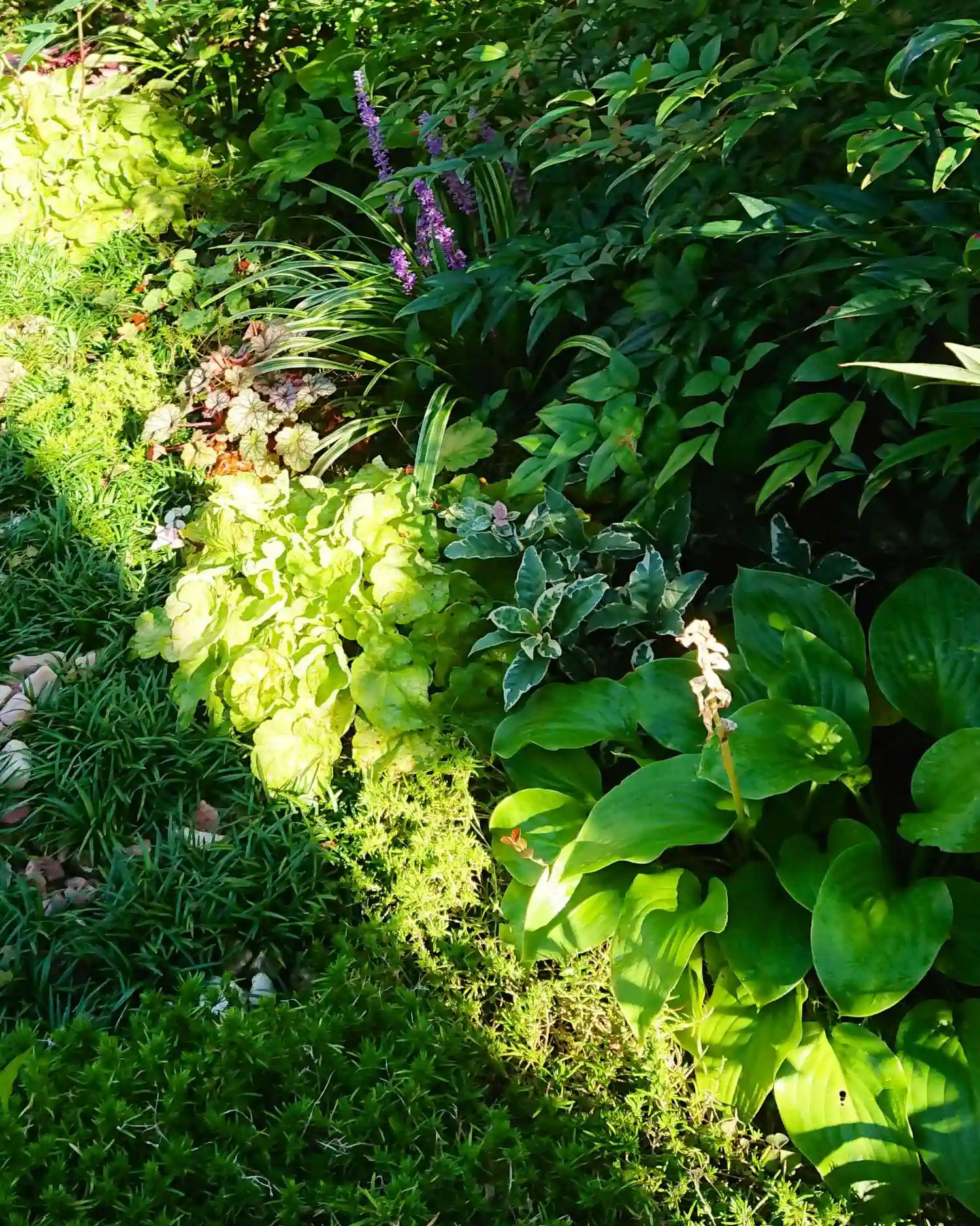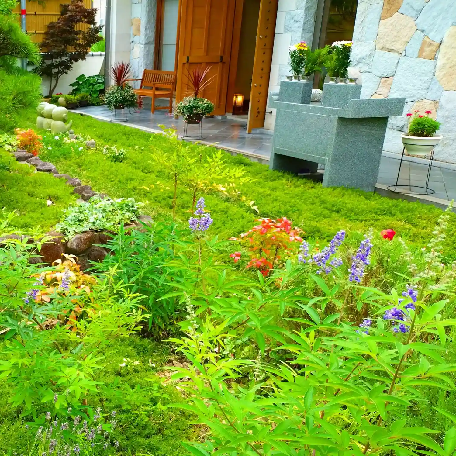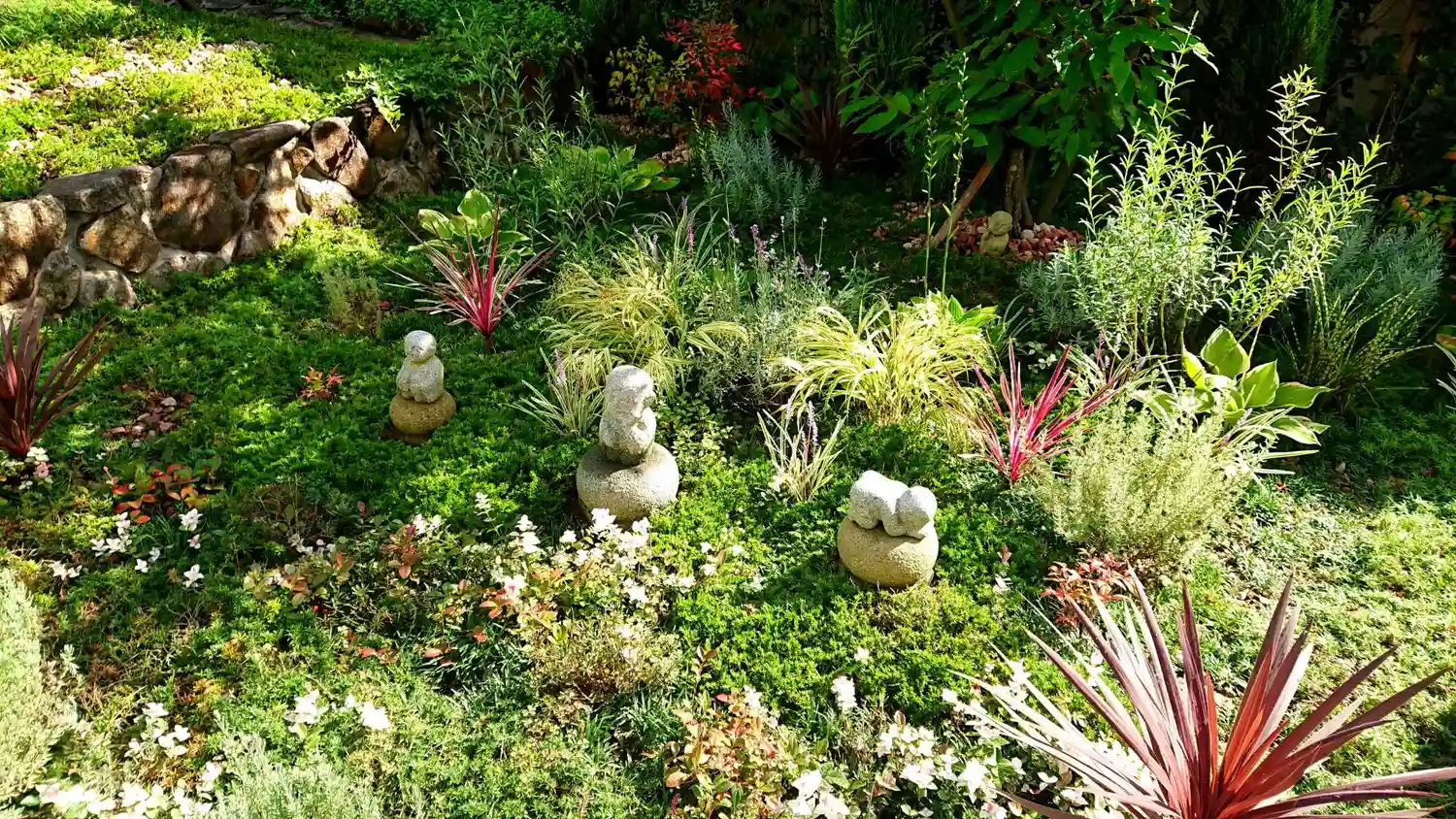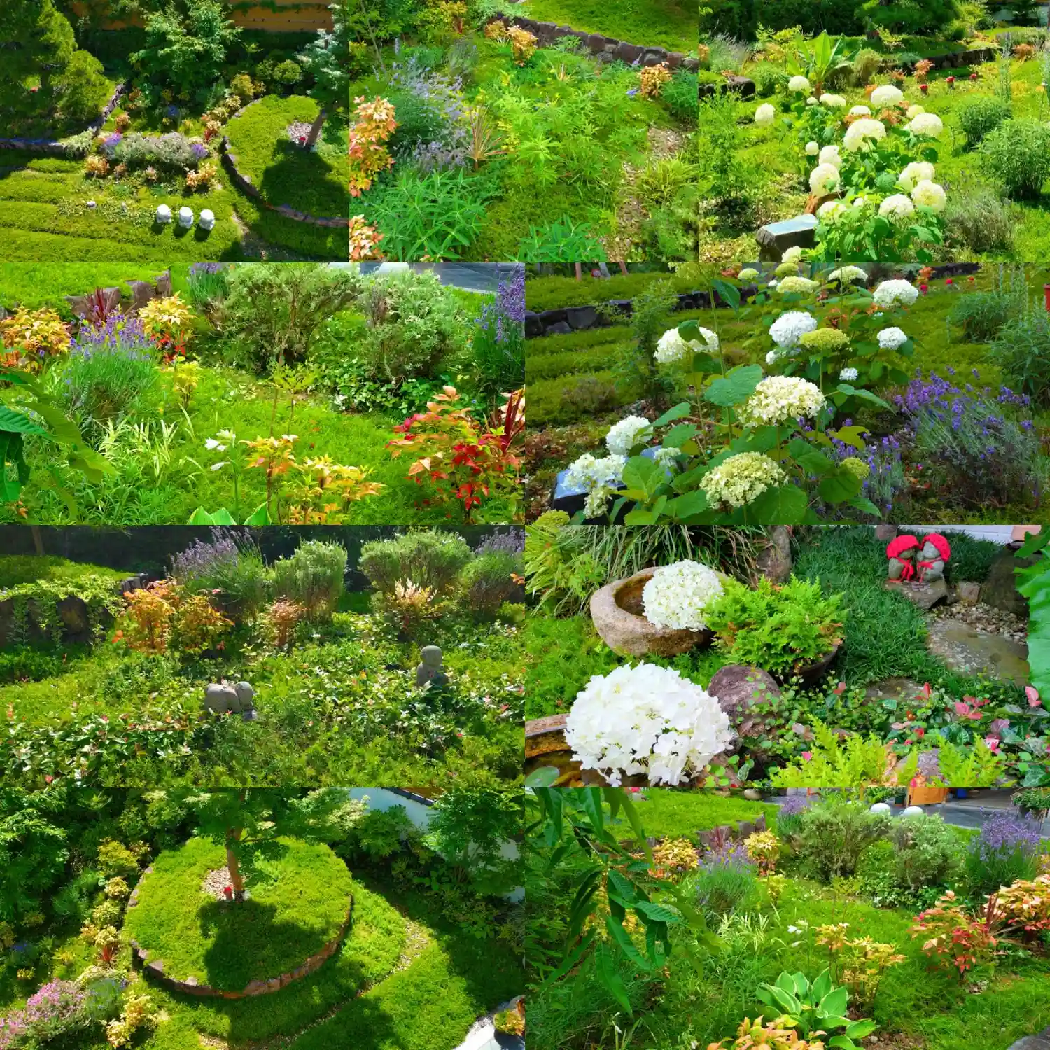 多年草のリーフ【風知草・ヤブラン・ギボウシ・セージ・ラベンダーなど】に囲まれたわらべ地蔵様🤗🌿