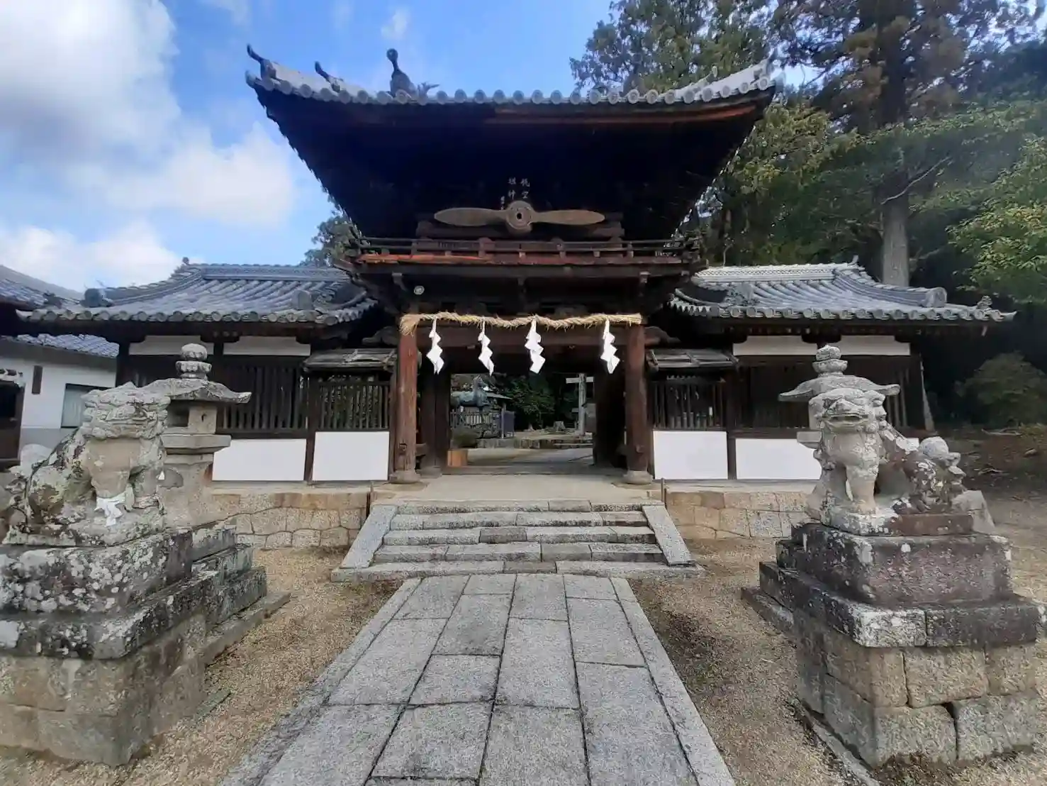 櫛玉饒速日命が天磐船に乗って空を飛んだとの故事により、櫛玉饒速日命は航空祖神として崇められており、楼門の上層部にはかつて戦闘機に使用されていたというプロペラが奉納され、飾られている。