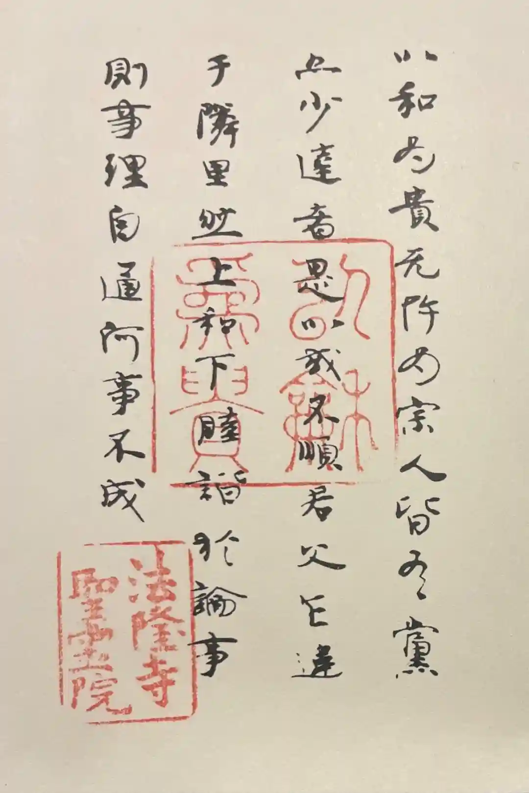 真ん中に「以和為貴」が墨書きされ、その下に天蓋飛天の印と「法隆學問寺」の印が押されています。