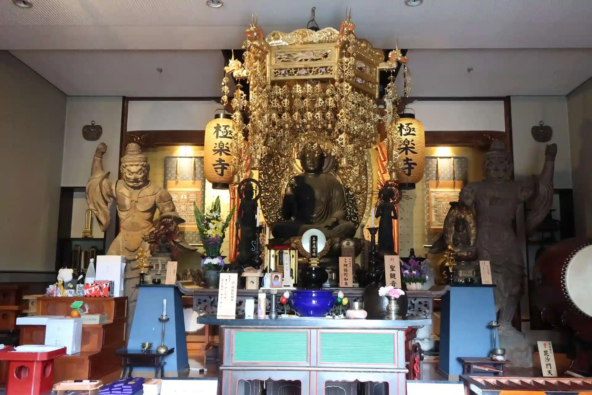 先ず本堂から。扉は閉じられていましたが「ご自由にご参拝下さい。」となっていました。(燕がお堂の中に入ってくるから。)扉を開けて堂内に、須弥壇の中尊は本尊·阿弥陀如来坐像、両脇に聖観音菩薩立像。阿弥陀三尊なら観音菩薩と勢至菩薩ですので、その代わりに安置されていると思います。須弥壇の右側には小さい大日如来と大きい毘沙門天、左側には小さい不動明王と大きい増長天です。左上からの照明のみでしたので右側は暗くてわかり辛かったです。(右上からの照明のスイッチが切れていたかも?)写真もフラッシュはよろしくないので点けずに撮影しているため暗いです。