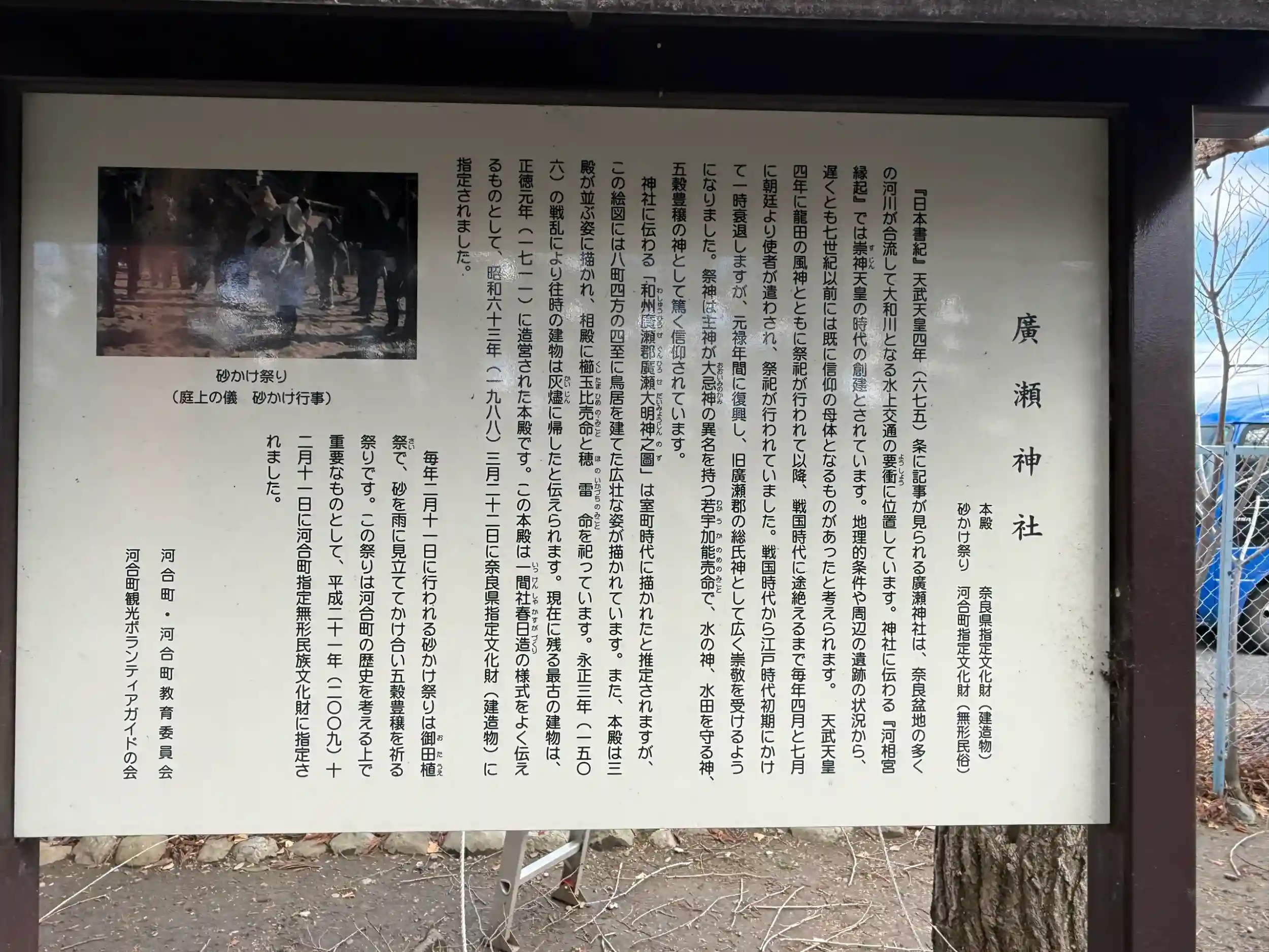 創建は崇神天皇の御代(みよ)と伝えられ、日本書紀には天武天皇四年(六七五)に「大忌神(おおいみのかみ)を廣瀬の河曲(かわわ)に祀らはしむ」と記され、これが廣瀬の大忌祭の始まりとされる。
