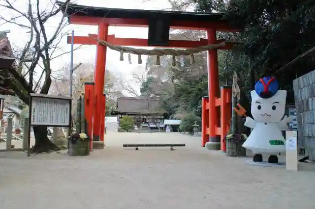 一の鳥居からの長い参道は静寂で心が清められます。二の鳥居では河合町のイメージキャラクター「すな丸」…
