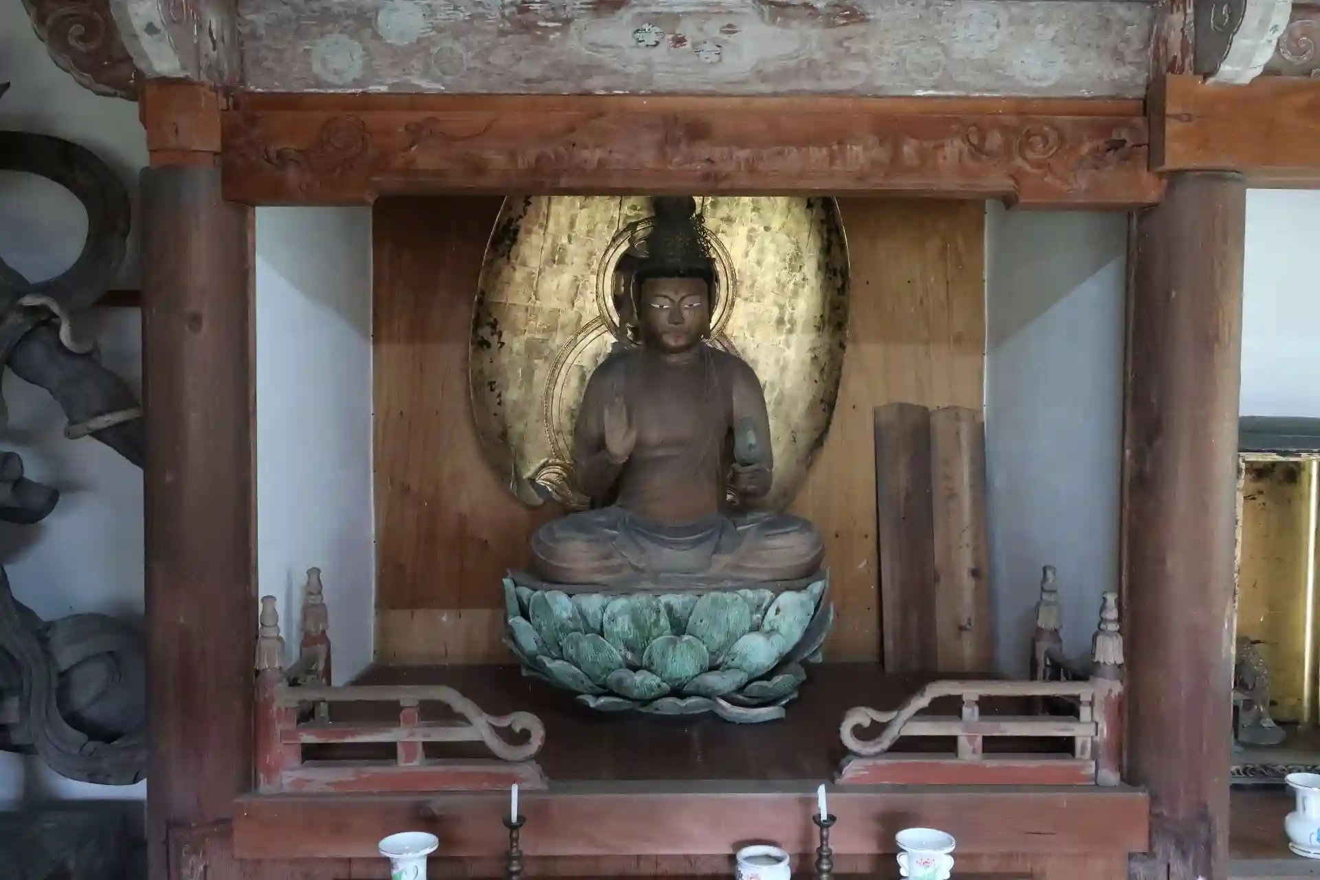 本尊の左側には深沙大将立像、高さ約197cm、彩色、鎌倉時代後期~南北朝時代頃の作。元々こちらに祀られていた訳ではなく、白石千坊(廃寺)に祀られていて、大坂冬の陣の戦火により遷されたと考えられています。深沙大将像で頭に思い浮かぶのは、和歌山・高野山、京都・金剛院、岐阜・横蔵寺、三重・神宮寺くらいですが、どれも1mそこそこの像であり、こちらは大きいです。撮影が素人で下手くそのため迫力が伝わらないのが残念です。