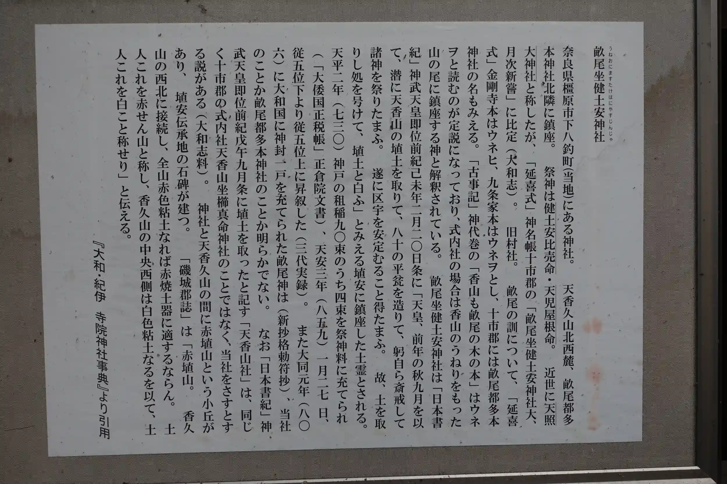 日本書紀の神武天皇即位前紀 己未年2月20日の条に記載があるとされる古社。