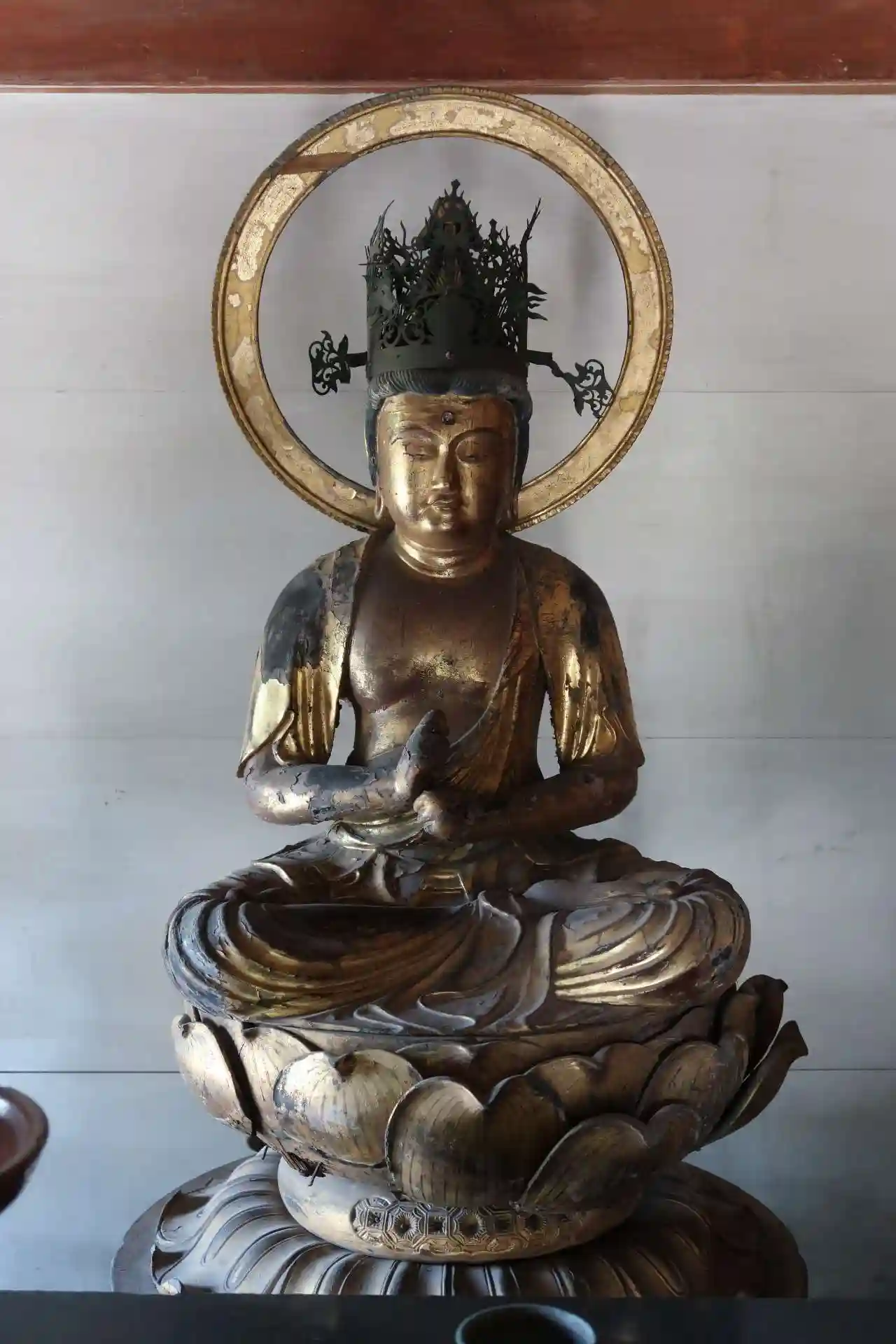 約束時刻より少し早く着きましたが、既にご担当の方がいらっしゃって、三重塔と本堂の扉を開けて頂いていました。暑い中お手数お掛けしました。先ずは三重塔から。建立年代は不明ですが、現存する塔は鎌倉時代中期の建立と考えられ重文です。なかなか格好良い塔です。扉が開かれていますので初層の中へ入らせて頂きました。心柱は見えませんが大日如来坐像が祀られています。高さ66cm、胎内墨書銘により1675年の作。三重塔を出て次に本堂へ。談山神社の旧本殿を移築したものと考えられており、「大織冠」と呼ばれています。