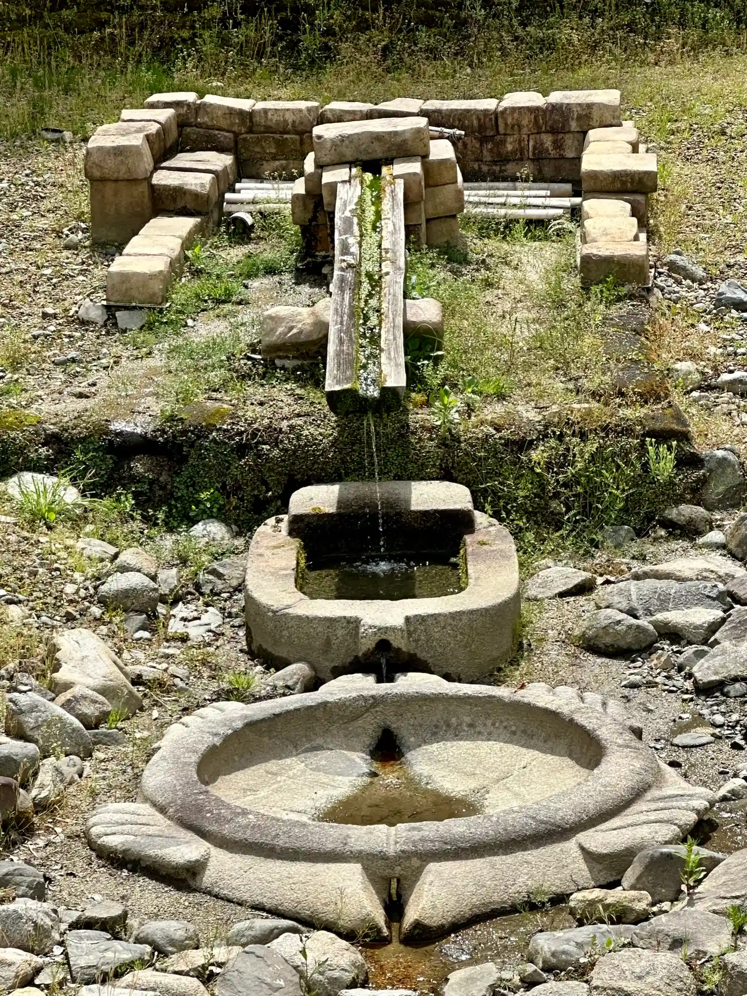 亀をかたどった石の水槽と
