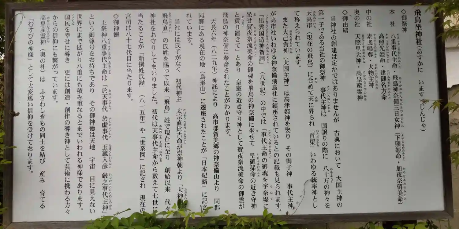 御祭神 八重事代主神 大物主神 飛鳥神奈備三日女神(賀夜奈流美乃御魂) 高皇産靈神