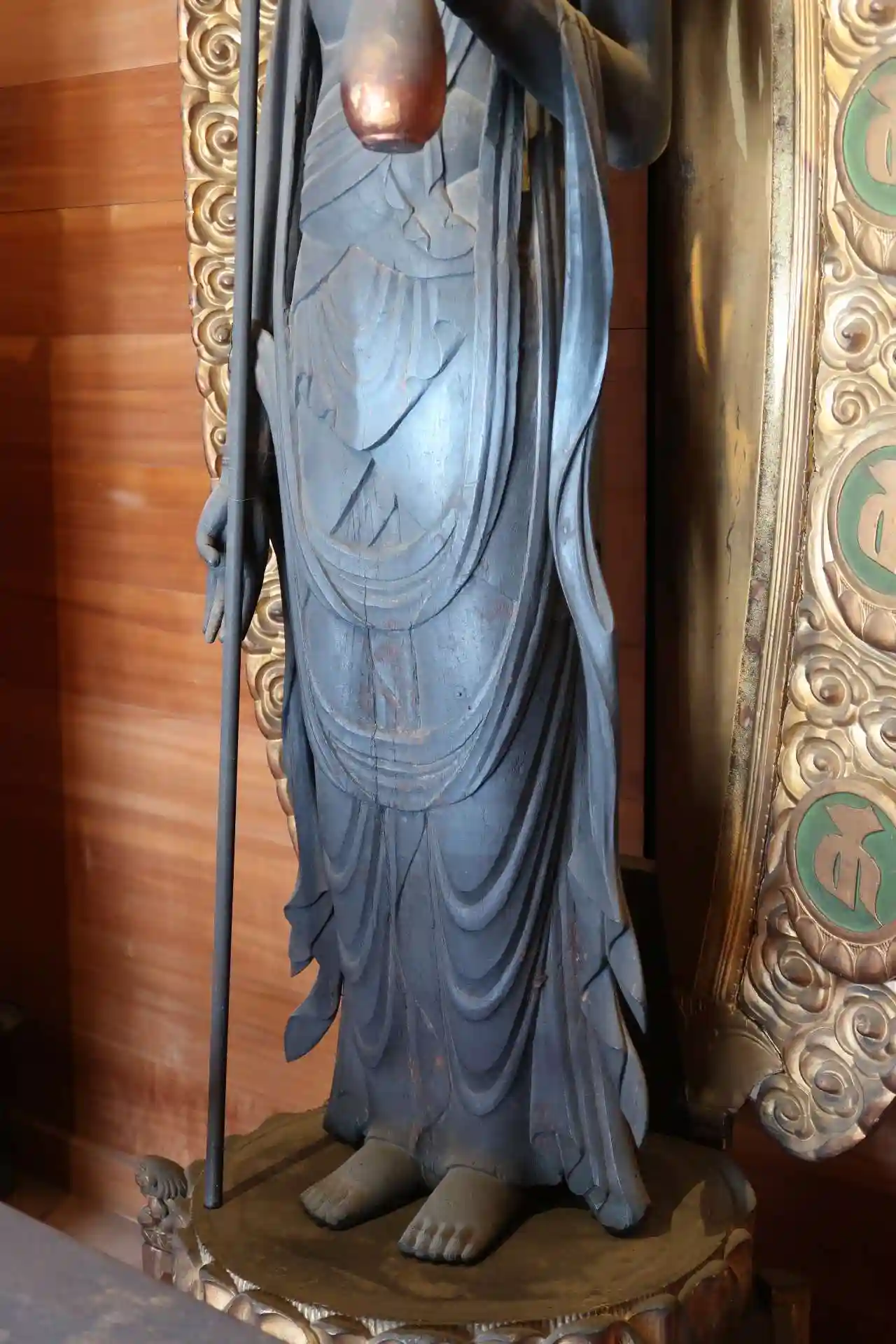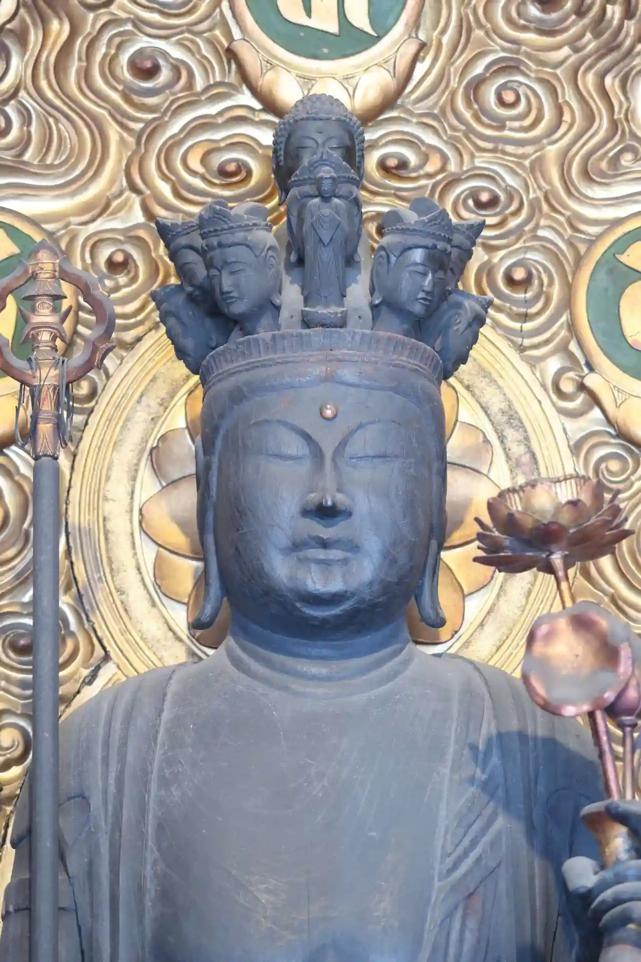 十一面観音立像は、けやきの一木造、高さ約178cm、すらっとした細身の体躯、目尻が上がったお顔が独特、膝の辺りに翻波式衣文。これらの特徴から平安時代中期の作と考えられています。また、右手の第一指を曲げて錫杖を持つ長谷寺式十一面観音と同形ですが、右手は後補のため元からそうなのか作り直されたかは不明との事です。