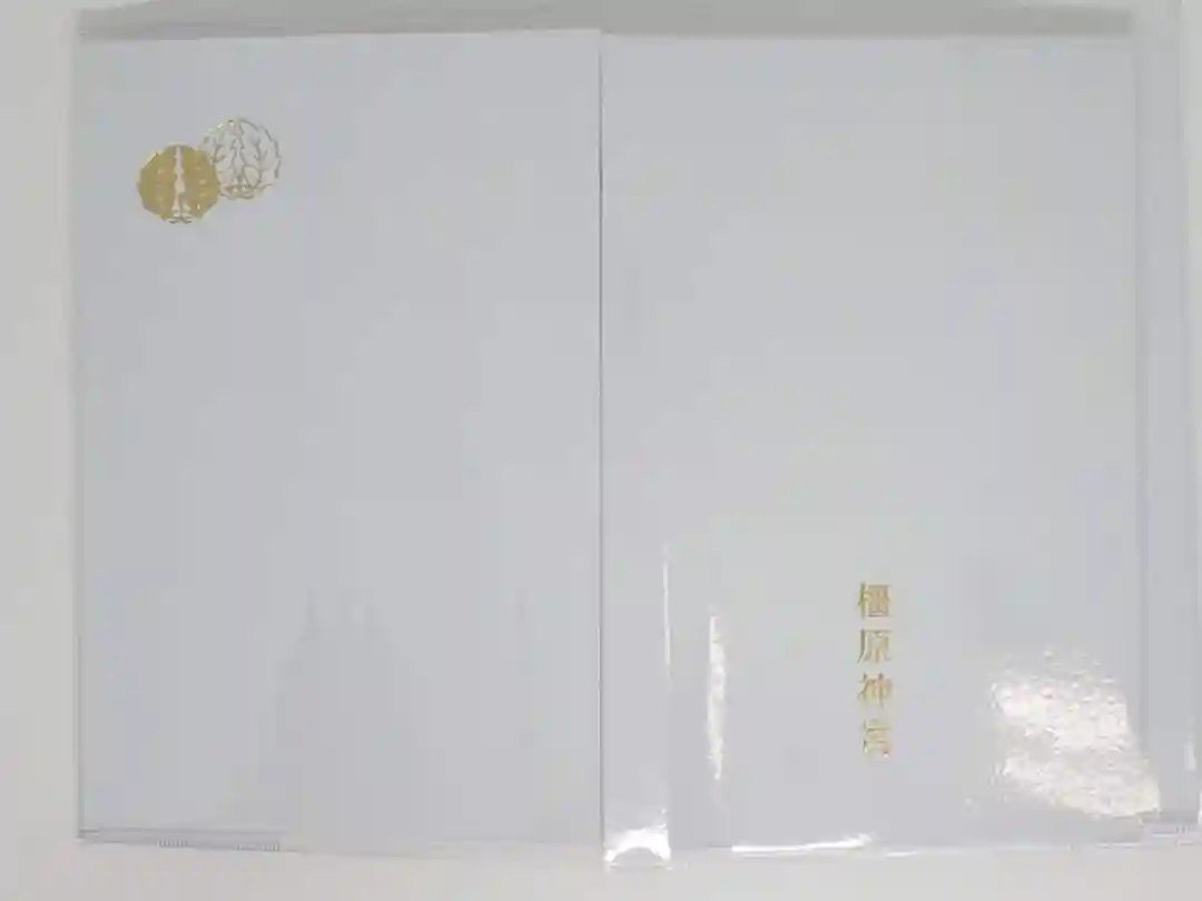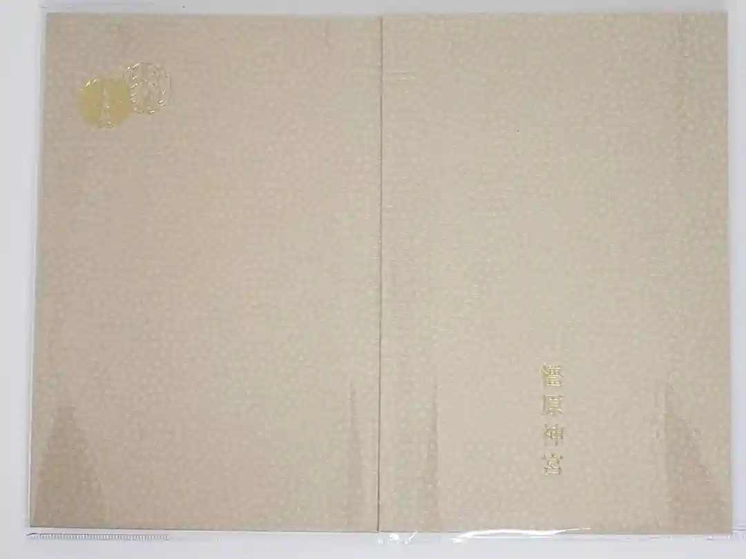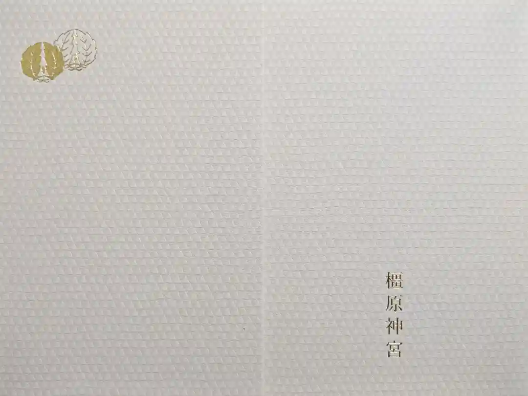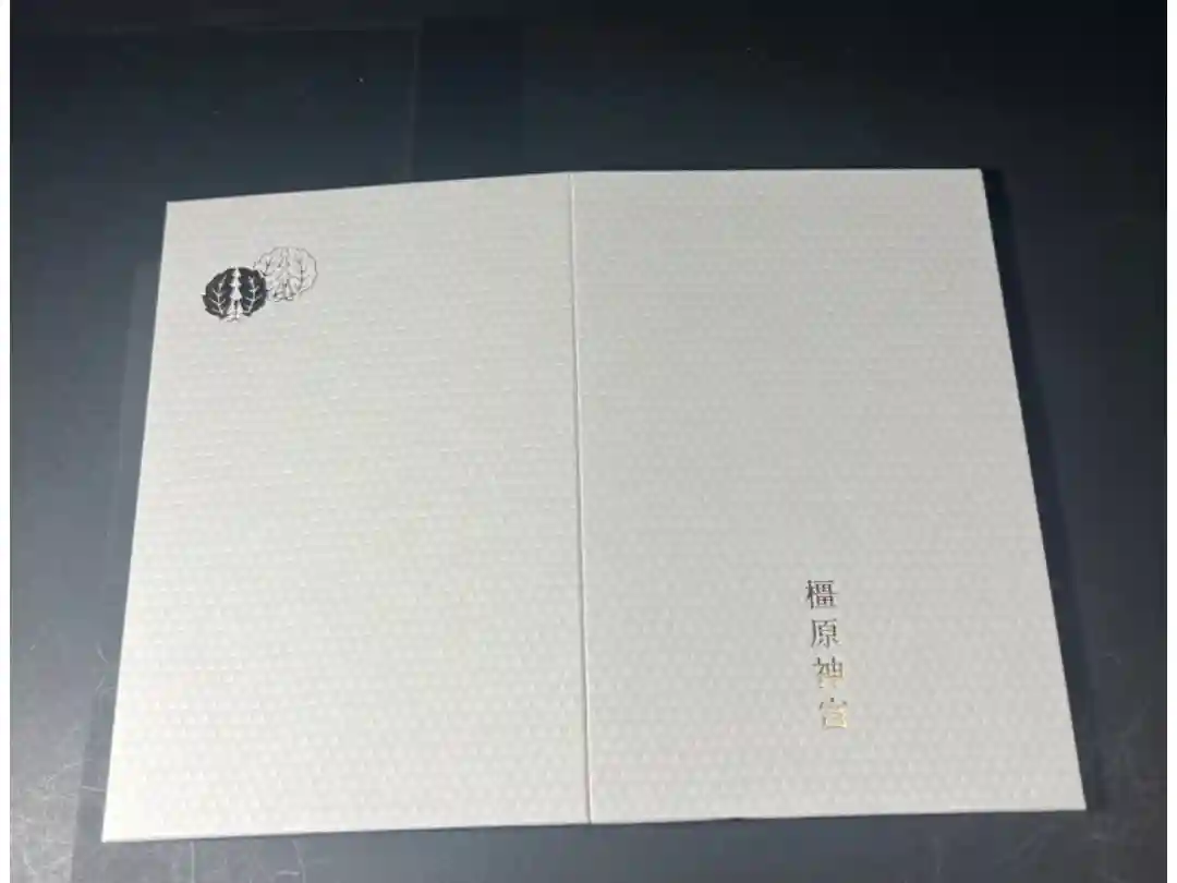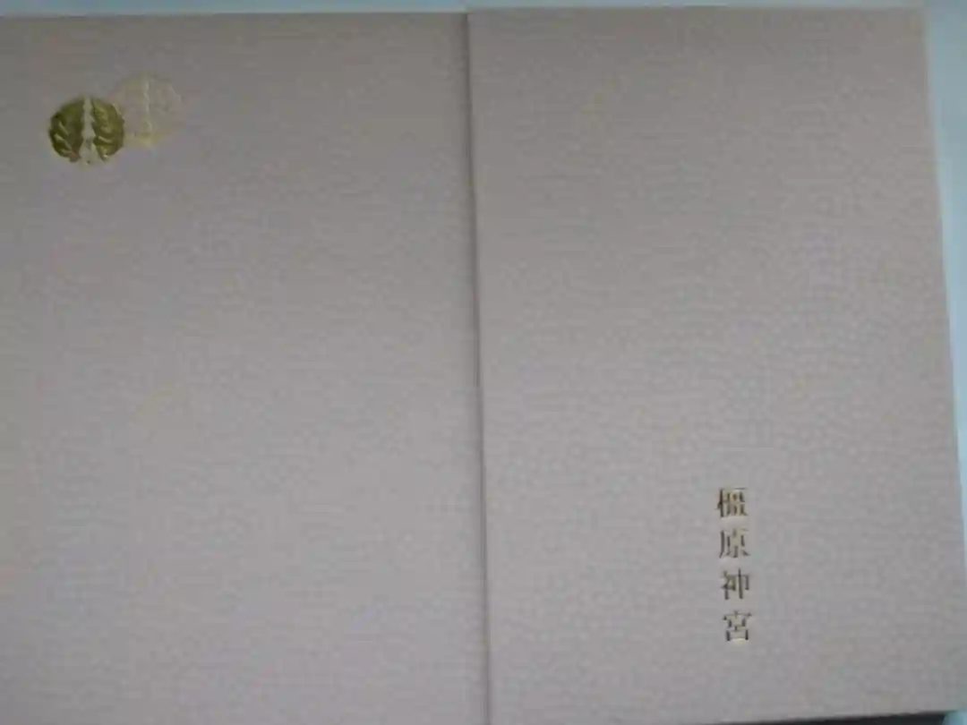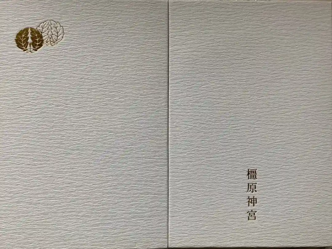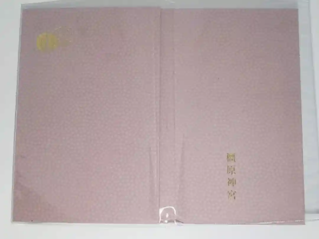 ピンク色をベースに、表面右上に橿原神宮の社紋「橿紋」が金箔押しで刻印されています。