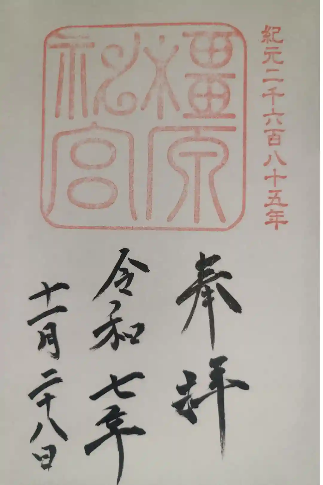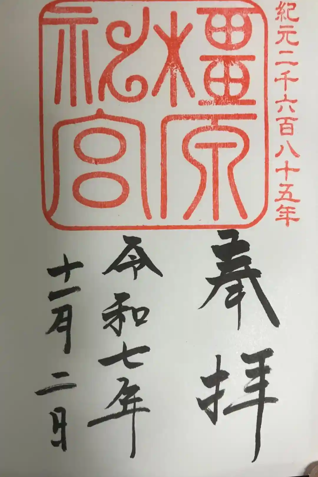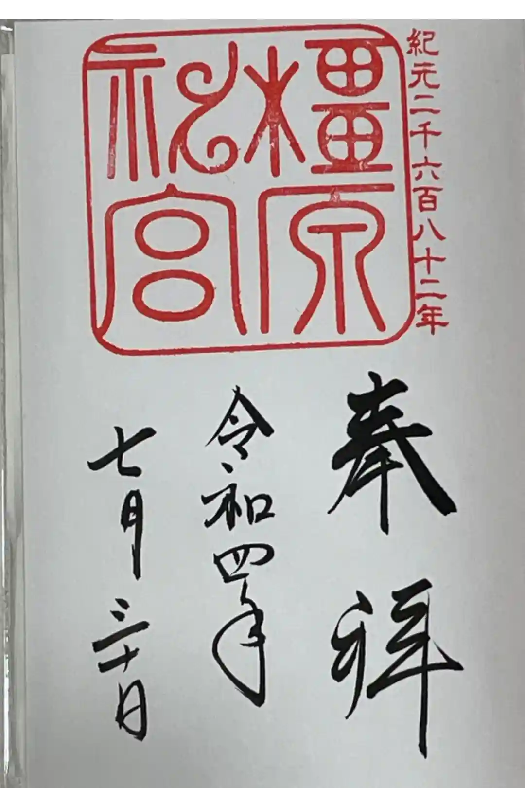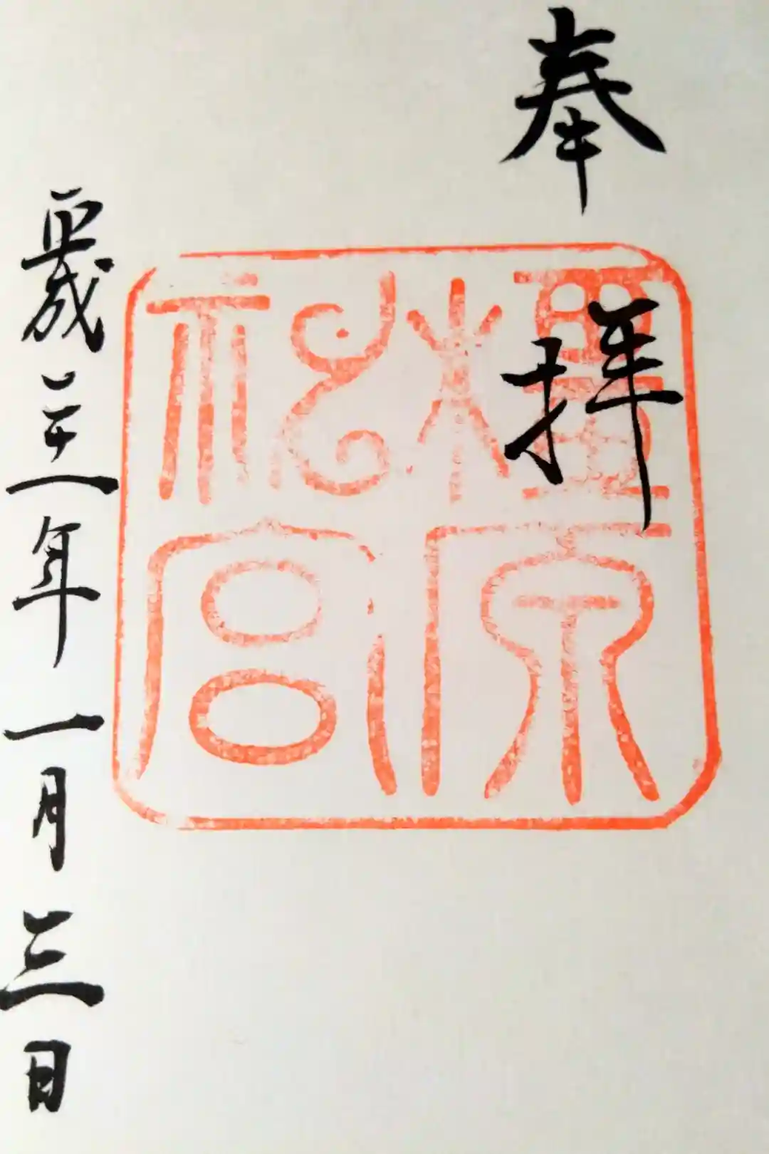 上半分に「橿原神宮」印が押され、下半分に「奉拝」「年号」「日付」が墨書きされています。