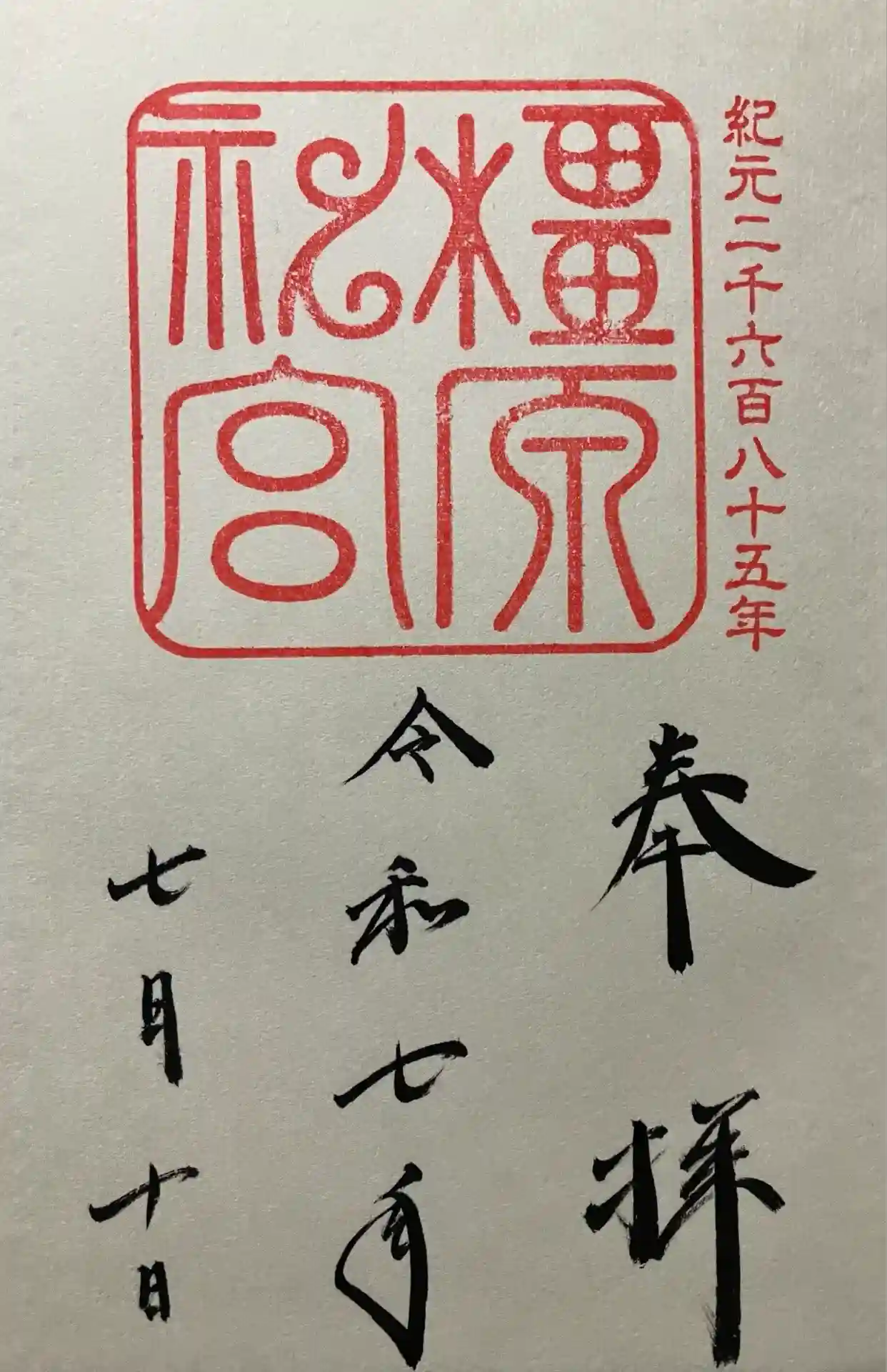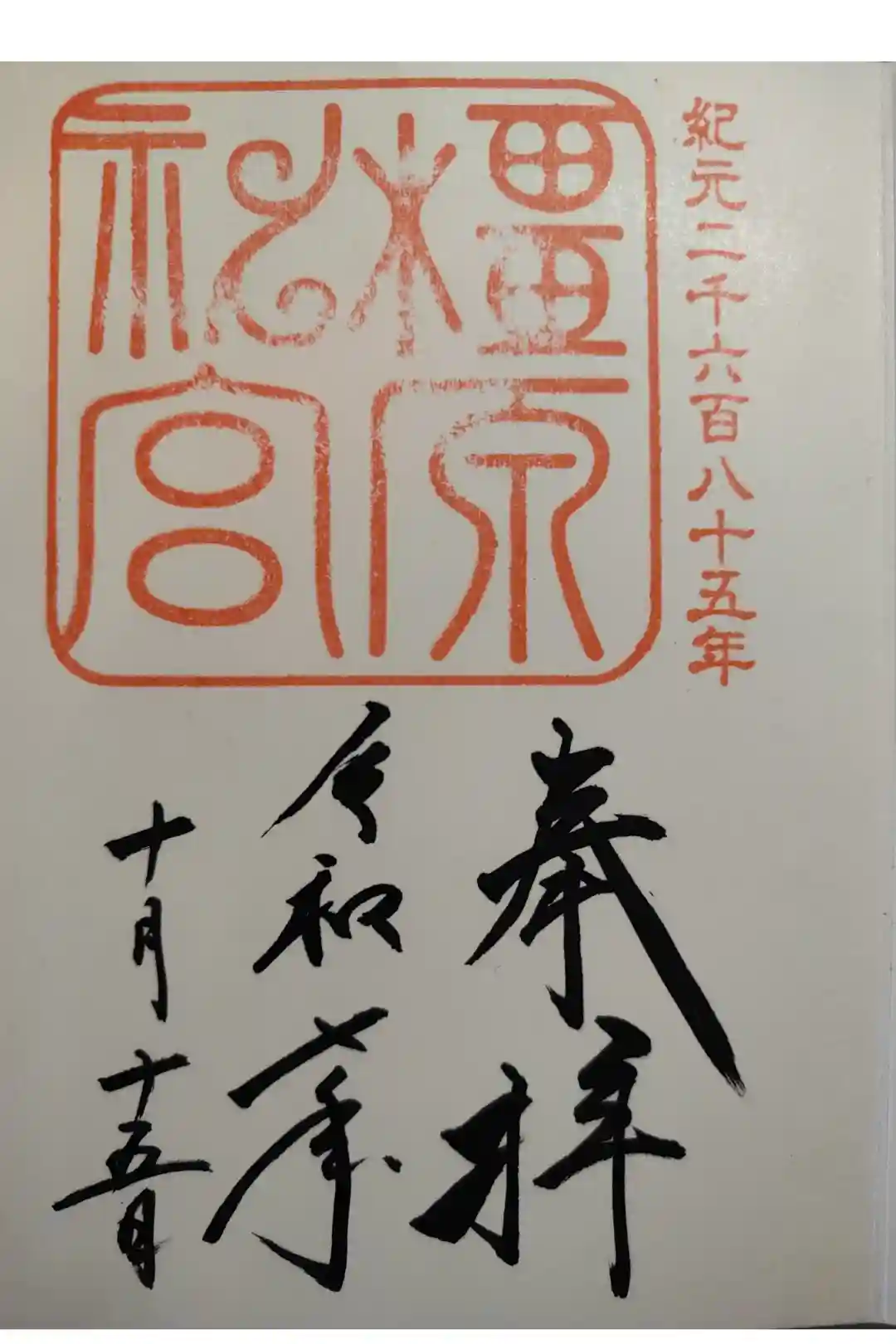 上半分に神社印が押され、下半分に「奉拝」「元号・日付」が墨書きされているシンプルなデザインです。2018年より長山稲荷社(境内末社)の御朱印が頒布が始まりました。 | |||