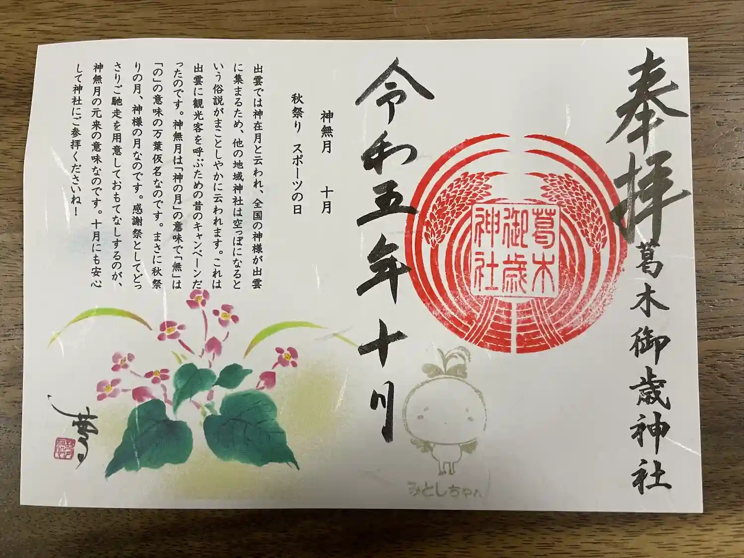 葛木御歳神社の御朱印四種 A5判 初穂料500円