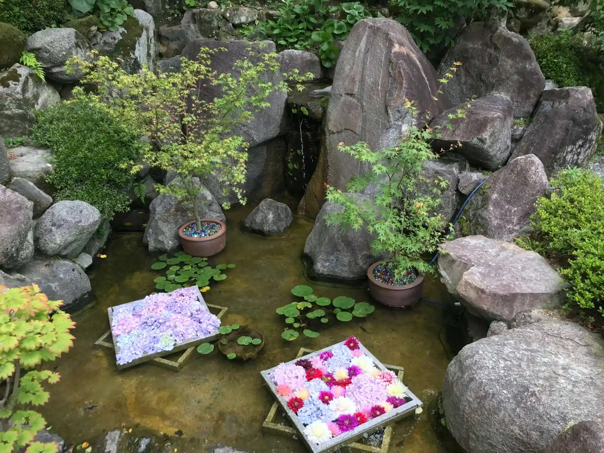 花手水や境内のデコレーションが涼しげであった。