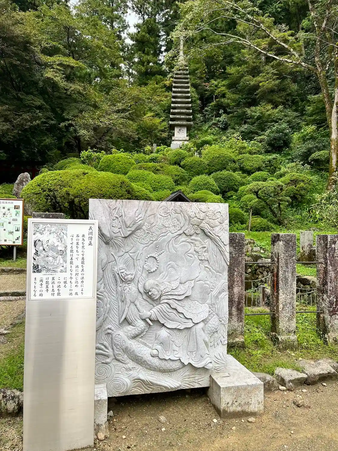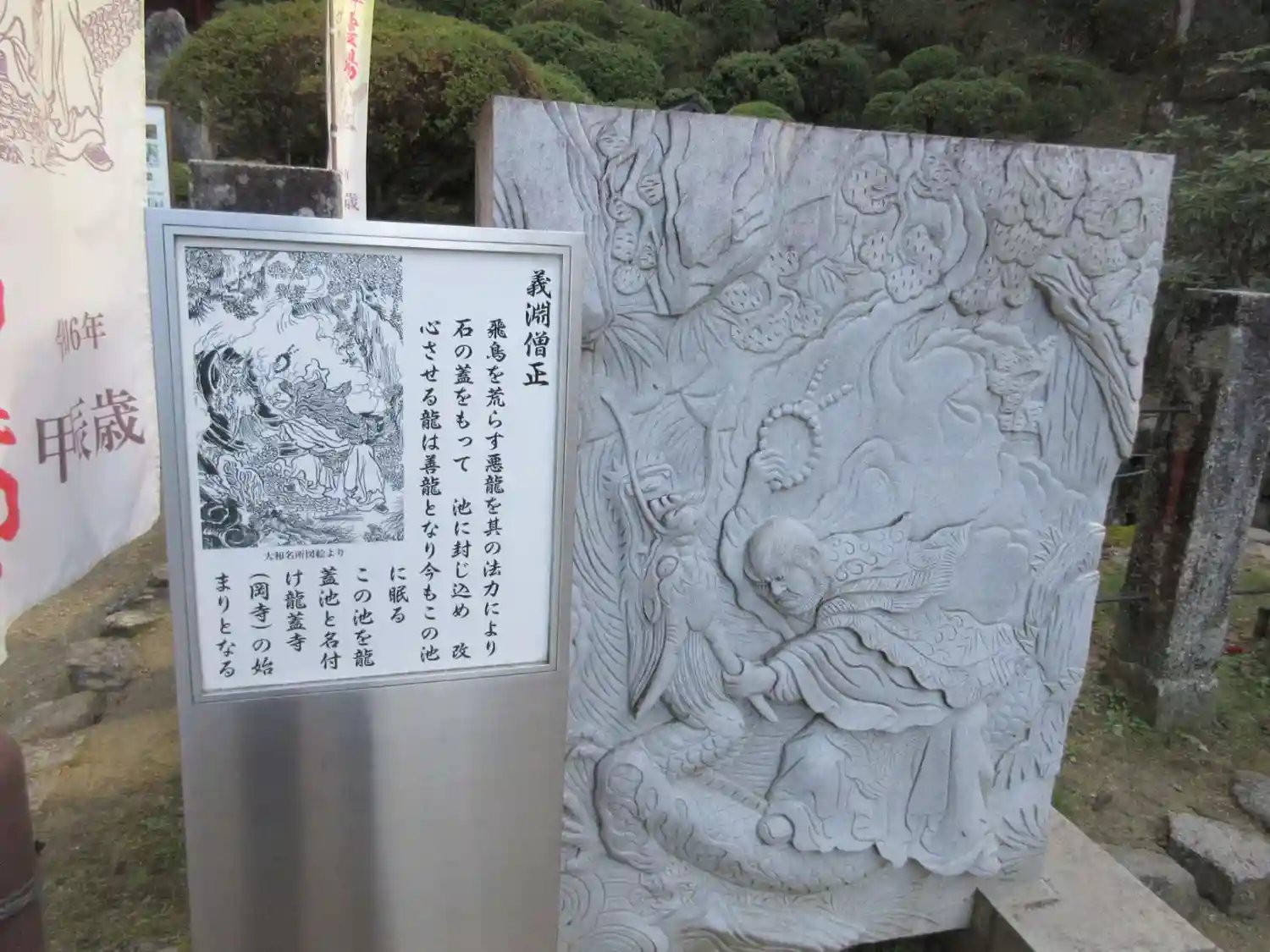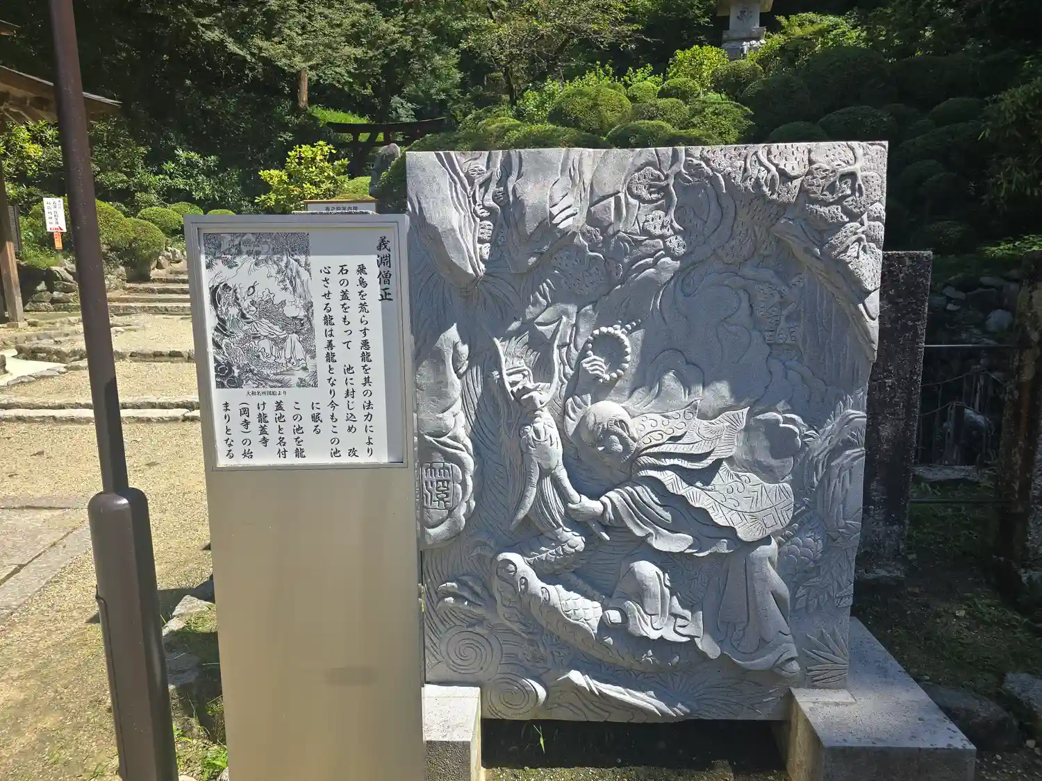 岡寺、別名龍蓋寺。昔飛鳥の村を荒らす悪龍がいて、村人は恐れていました。法力をお持ちの義淵僧正は、その龍を池に閉じ込め大きな石で蓋をされたそうです。