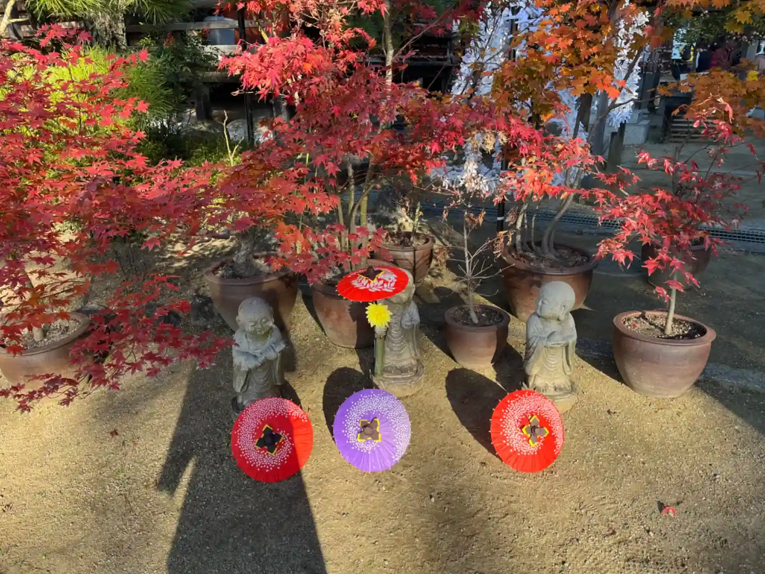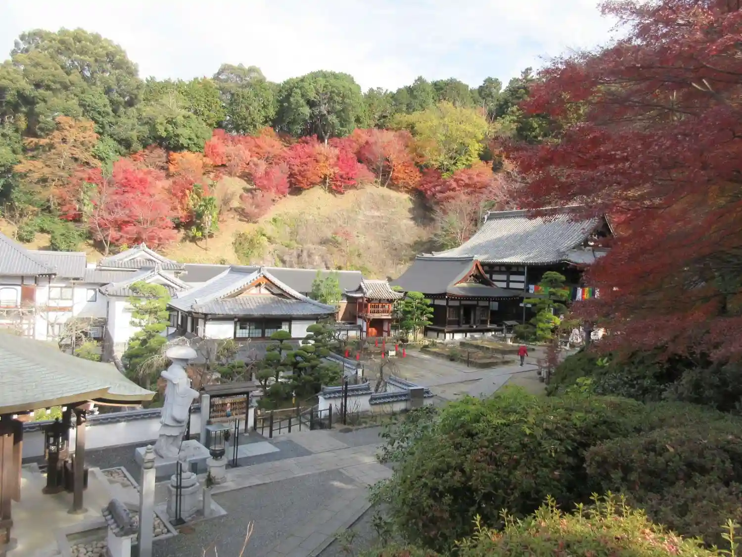 紅葉🍁した木々を背に、ご本堂がひときわ美しく感じられます。