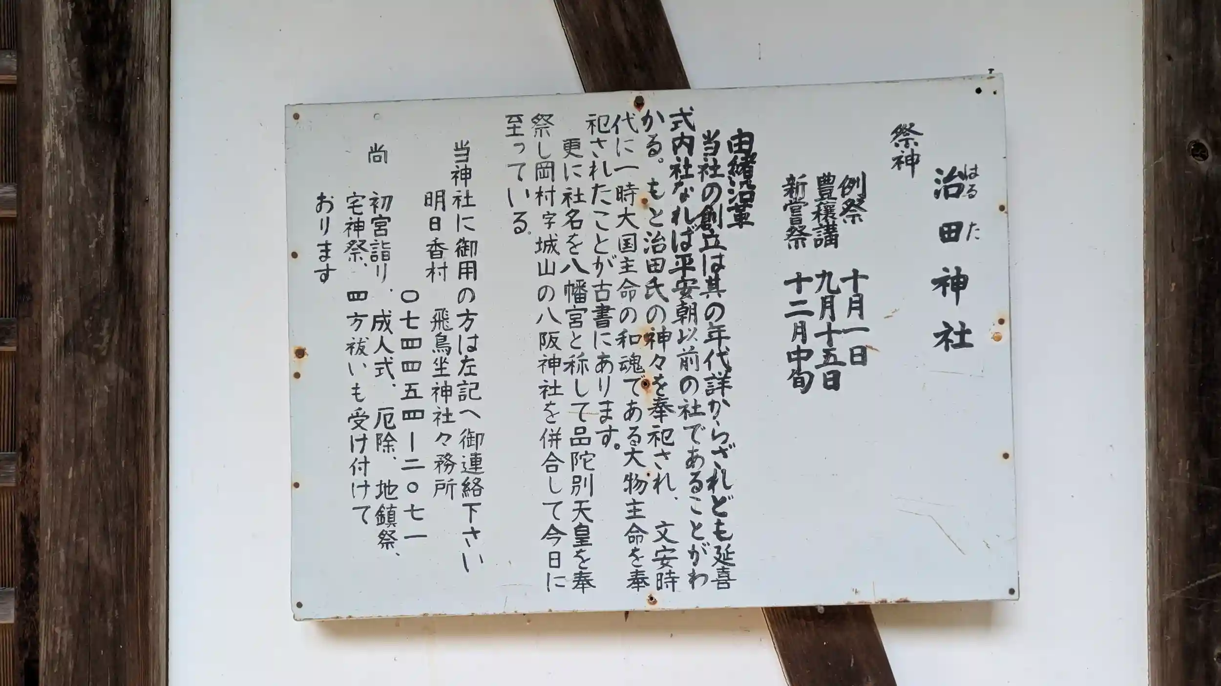 社務所前由緒。連絡先は飛鳥坐神社とのこと。飛鳥坐神社さんも兼務社多そう・・・