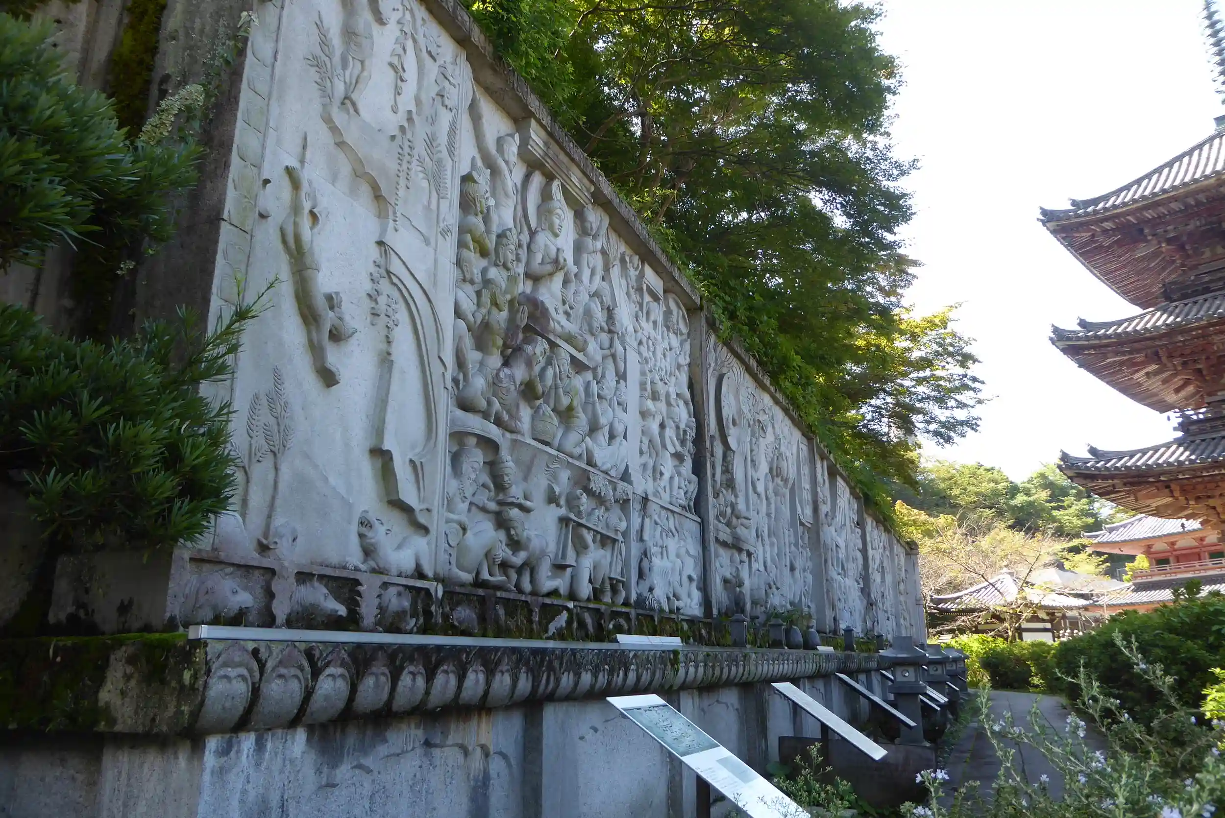 大きな石壁に釈尊の一代記を連綿と描かれています。