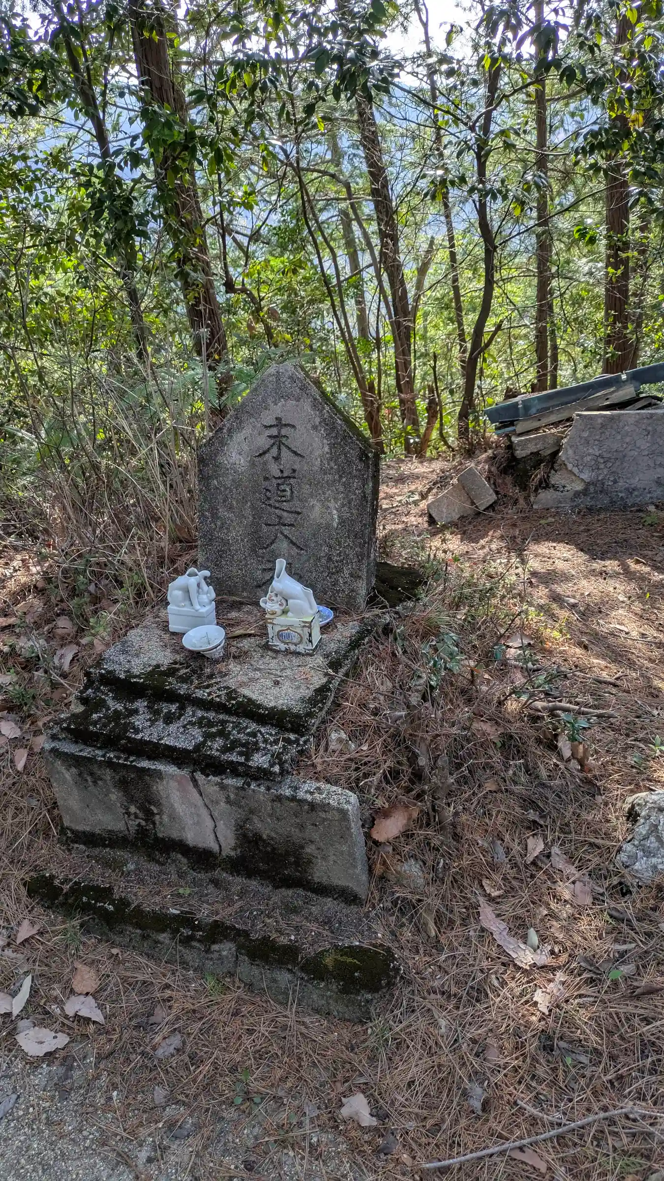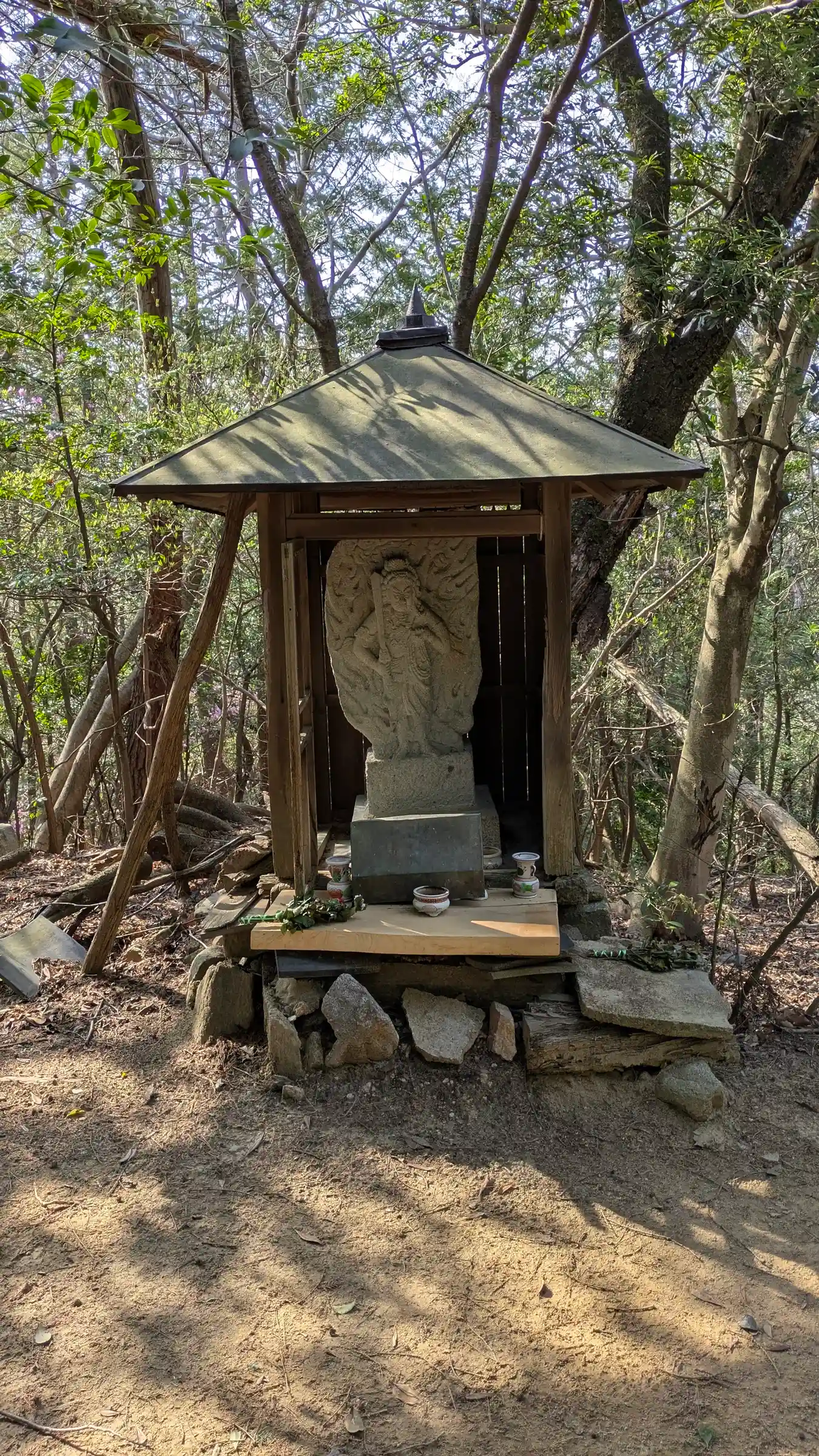 山頂に着くと鳥居と小さな社殿、御不動さんが鎮座。社殿向かいには休憩所の様な建屋がありこちらはわりときれいでした。