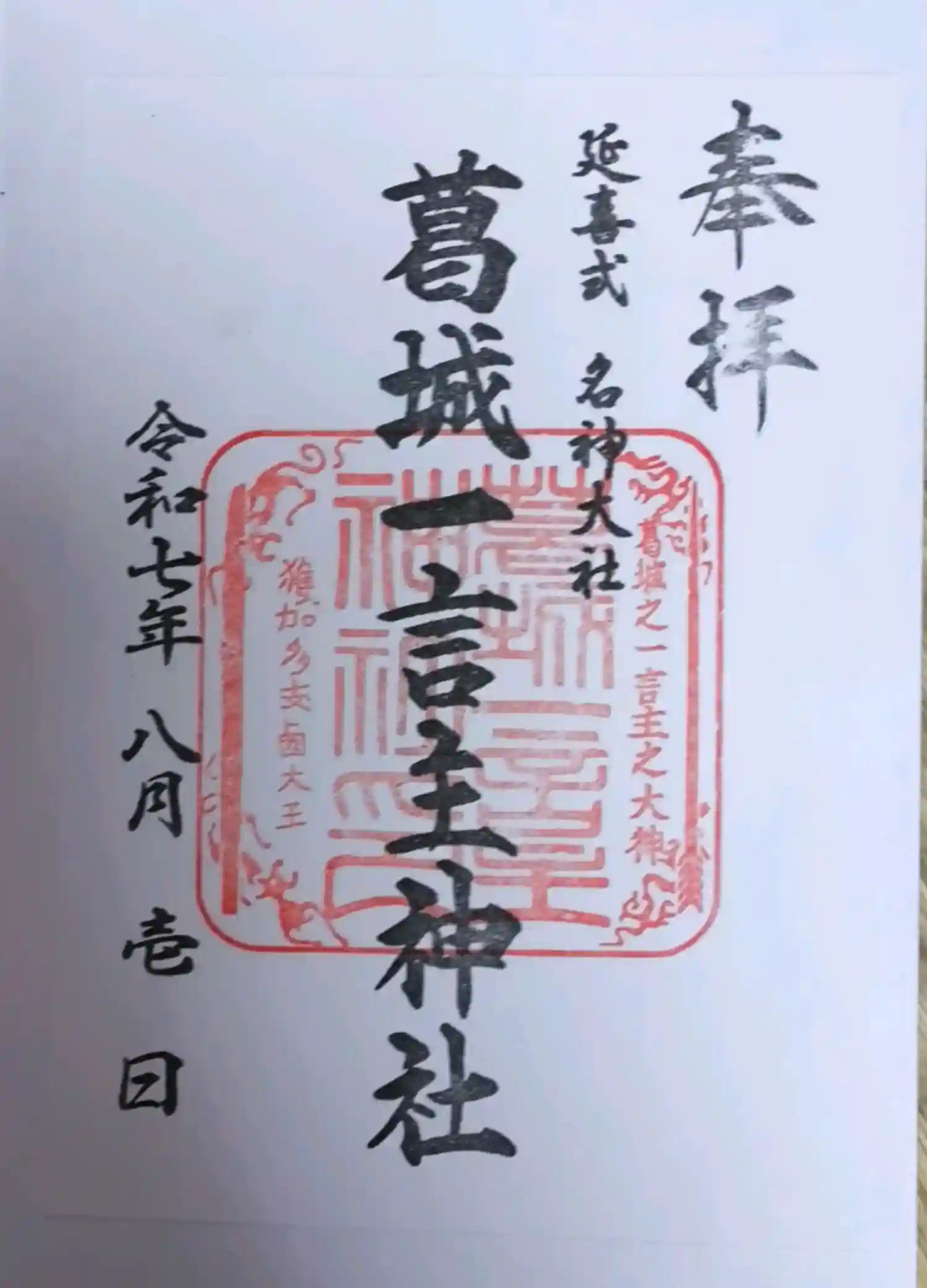 近世では、「いちごんさん」と呼ばれ一言の願いであれば何事もお聴き下さる神様として崇め親しまれ広く信仰されており、また全国各地の一言主大神を御祭神とする神社の総本社であります