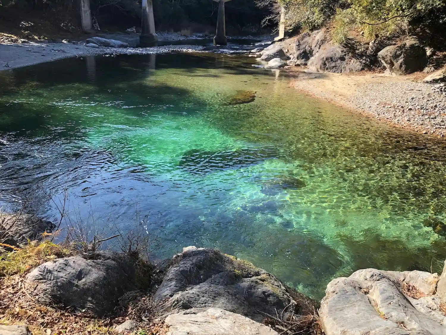 向かい側の川の水がとても綺麗でした。