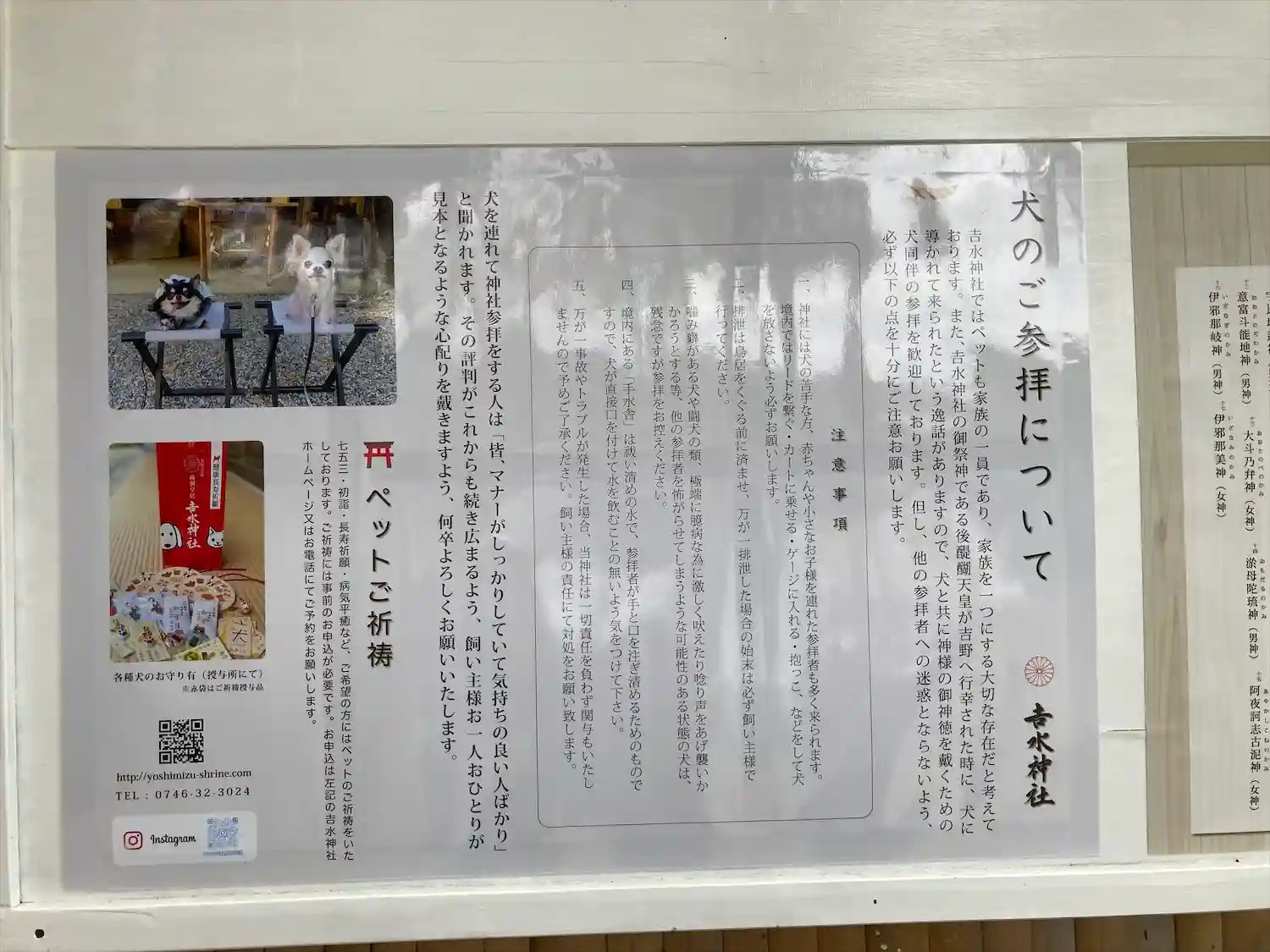 ③ペットは家族の一員として犬と一緒に参拝可能。さらに犬好きの宮司さんにより犬の無病息災を願う祈祷をして頂く事も可能です。私も大事なペット用のお守りをいただきました。