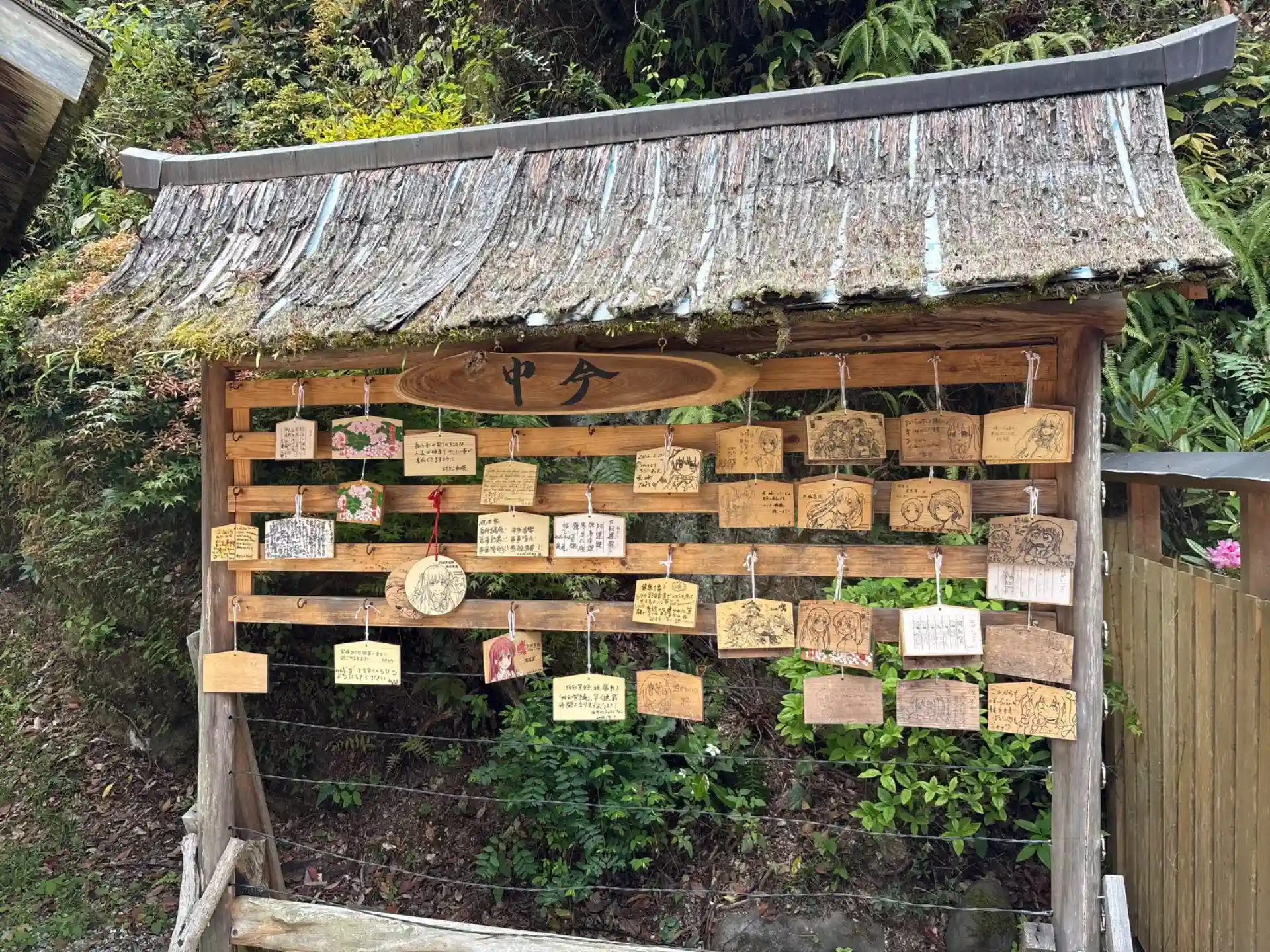 アニメの聖地でキャラクターの描かれた絵馬が並んでいました。