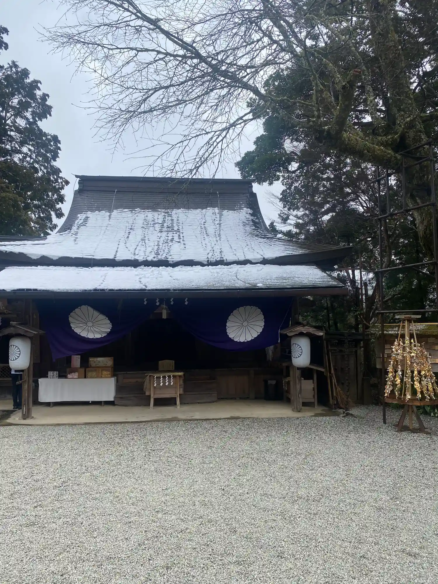 吉水神社へ⛩️参拝。春は、秀吉が花見の本陣にした場所で、今日は、少し雪化粧。また庭から見える蔵王大…