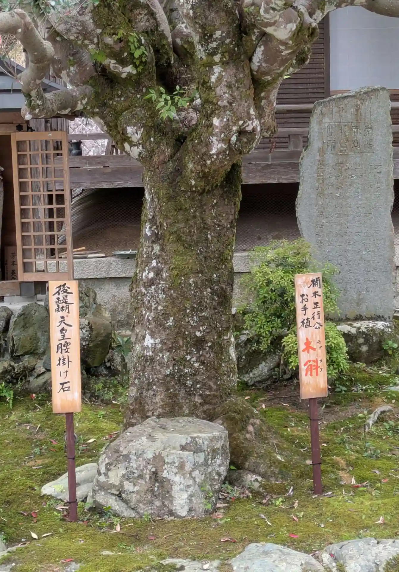 後醍醐天皇腰掛け石、楠木正成お手植えの木斛(もっこく)