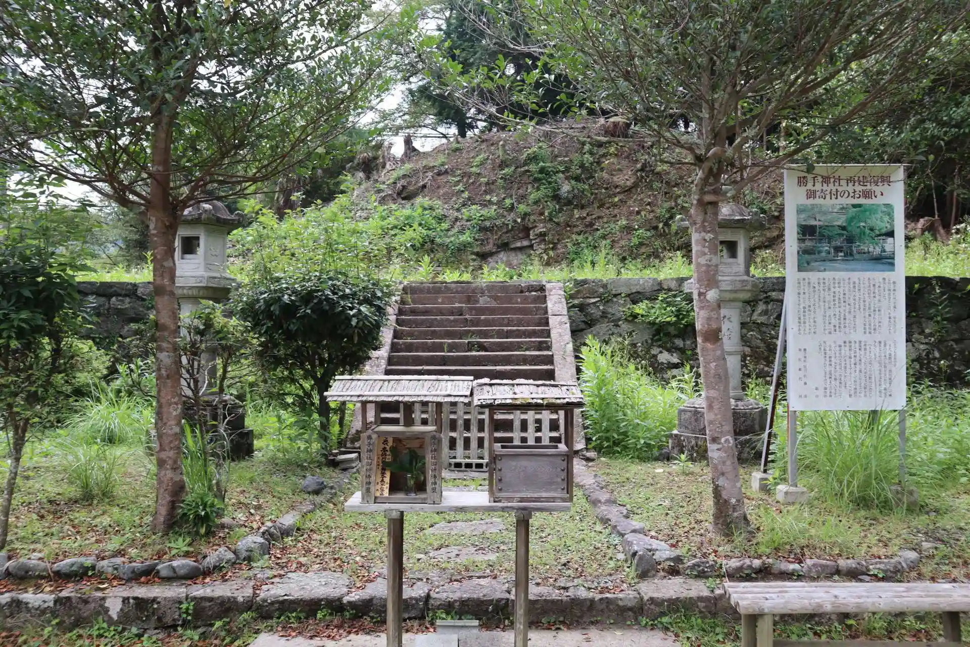 残念なことに、勝手神社は平成13年(2001年)、不審火で社殿が焼失してしまいました。 鳥居だけが残されており、かつて本殿があったであろう場所は野草が生い茂り、再建復興の寄付を募る看板が物寂しく映ります。 創建年代は不詳なるも地元の記録文献「日雄寺継統記」では、孝安天皇6年(紀元前386年)との記述があり、大海人皇子/天武天皇(おおあまのみこ)が社殿で琴を奏でたところ、天女が舞い降りて五度袖を振りつつ舞ったと伝えられ、雅楽「五節の舞(ごせちのまい)」の発祥地とされています。 また、文治元年(1185年)雪の吉野山で涙ながらに源義経と別れた静御前が、追手に捕えられた際に社前で雅な法楽の舞を舞ったという伝説があり、境内にはその「舞塚」が残されています。 御祭神は、天之忍穂耳命(あめのおしほみみのみこと)・大山祇命(おおやまづみのみこと)・久久能智命(くくのちのみこと)・木花咲耶姫命(このはなさくやひめのみこと)・苔虫命(こけむしのみこと)・葉野姫命(はのひめのみこと)の六神で、現在は𠮷水神社に仮遷座されていて、御朱印もそちらで対応いただけます。