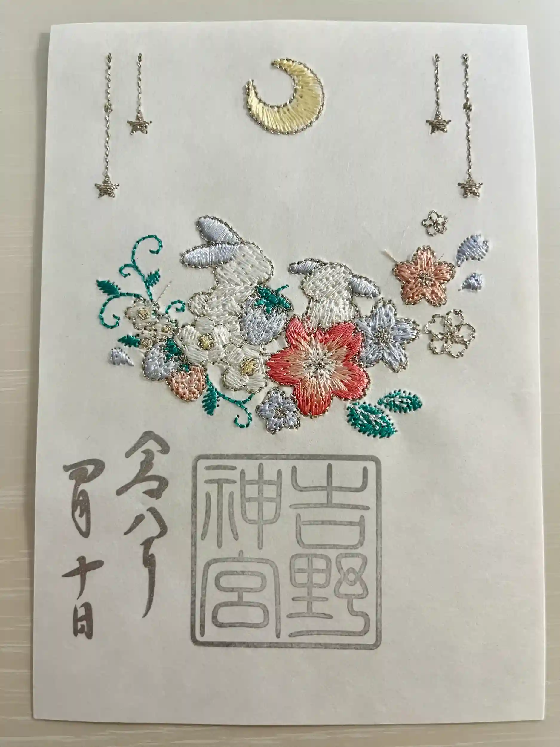 桜うさぎと苺、刺繍の御朱印(銀色)です。涼やかながら可愛いデザインです。