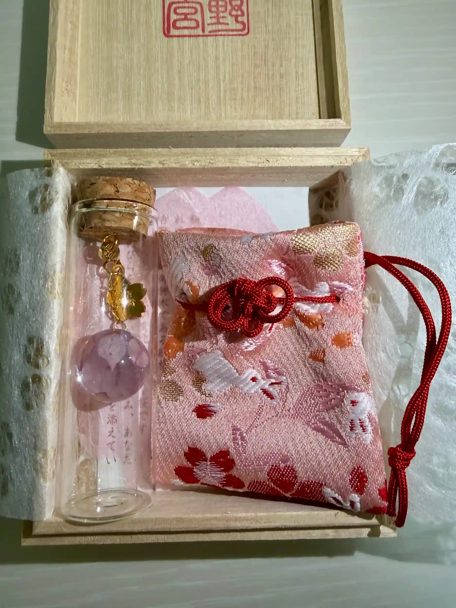 境内の御神木の桜の花びらが使われている桜玉守です🌸お守り、袋をそれぞれ選びます。