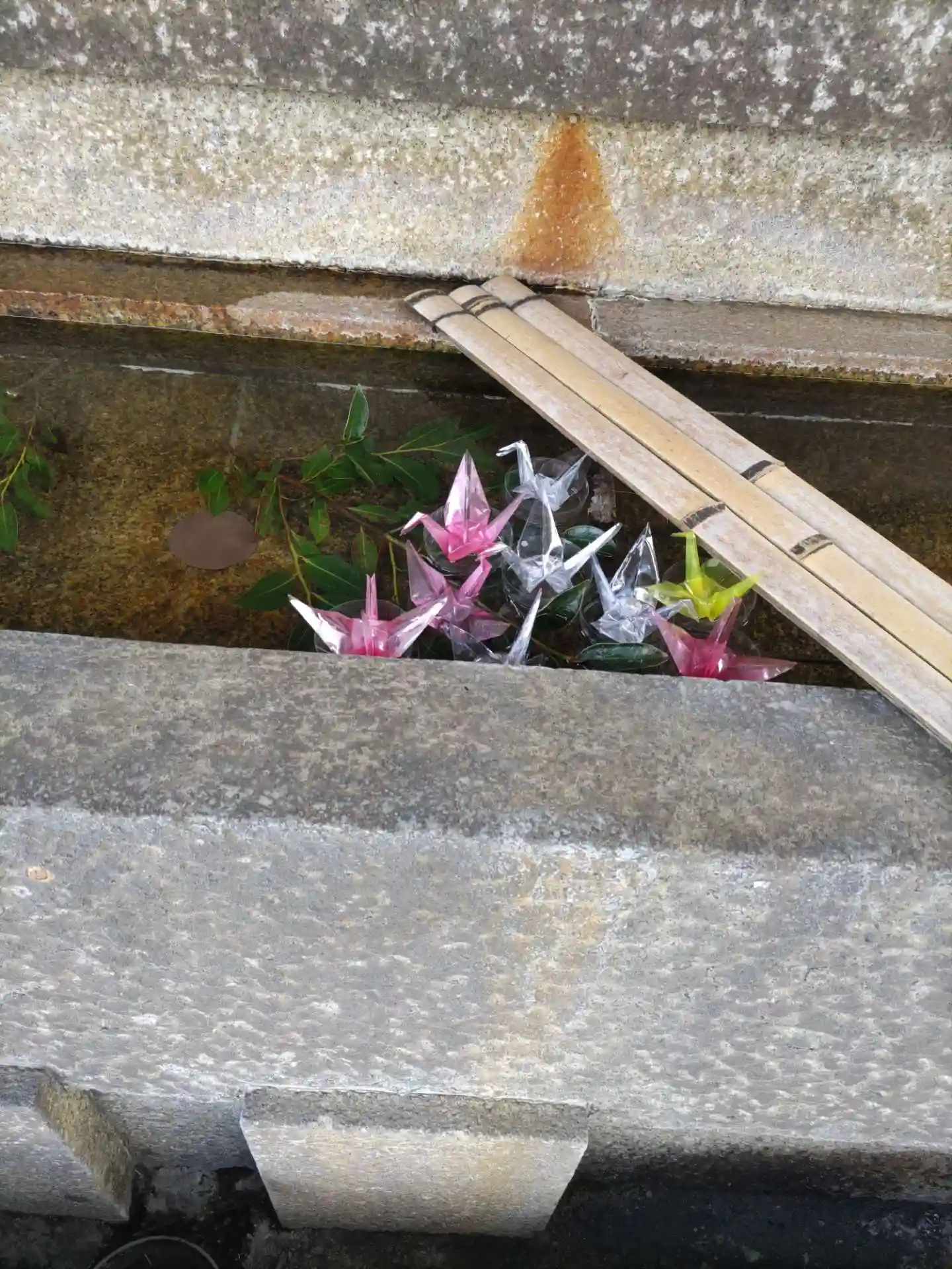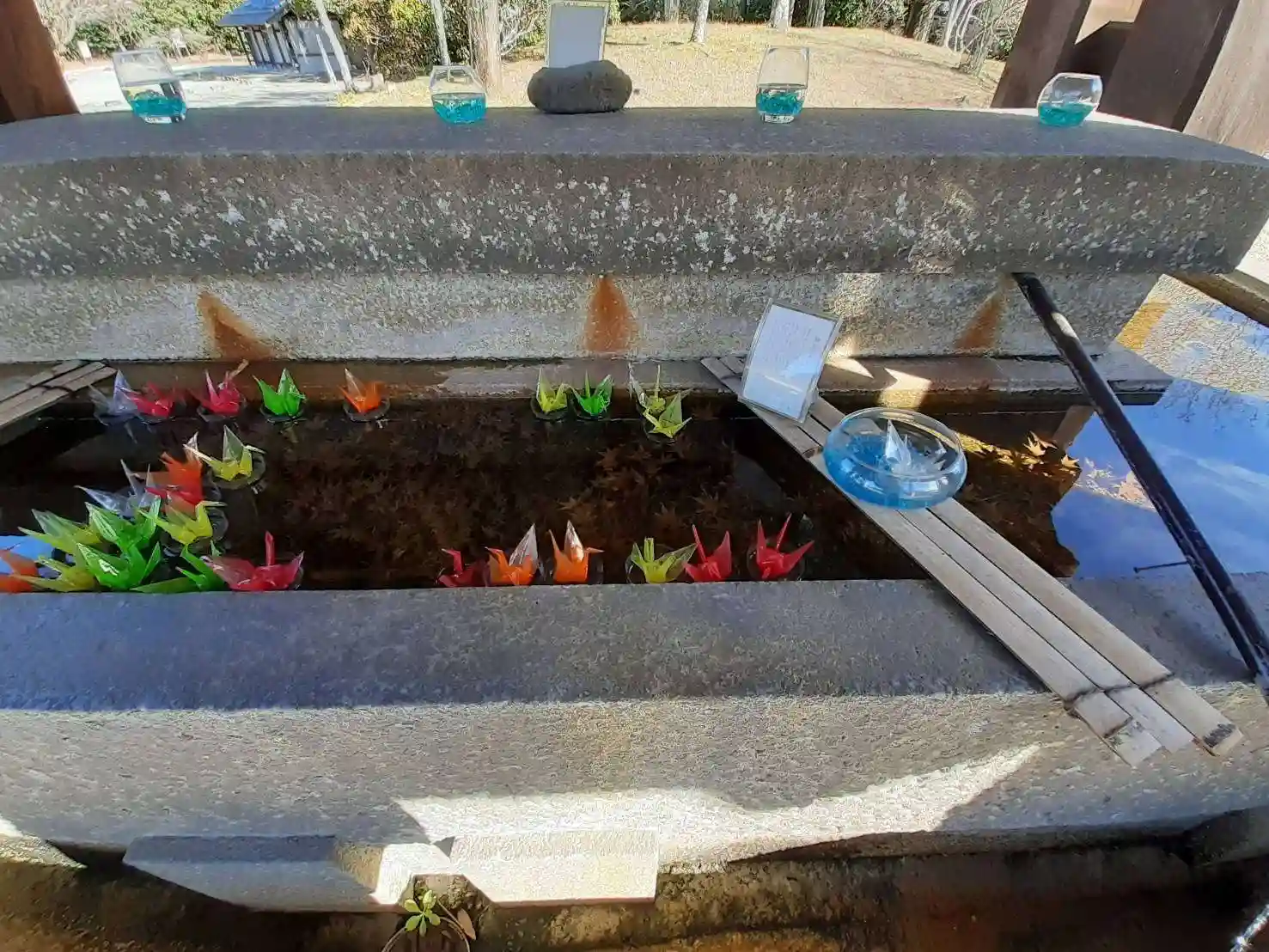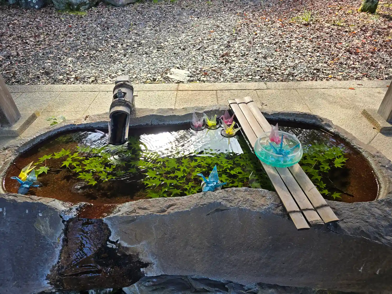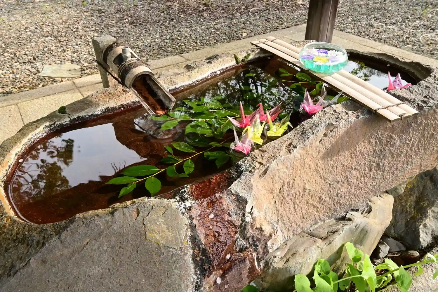 落ち着いた雰囲気で、手水のスケルトンの折り鶴が綺麗だった。