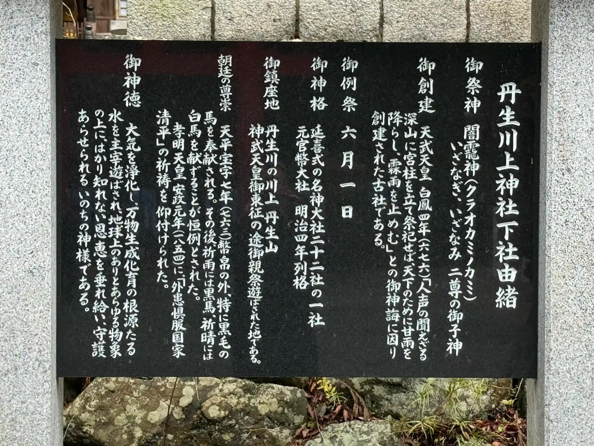 飛鳥時代に天武天皇によって675年に創建された社。延喜式内社、名神大社、二十二社、官幣大社と、歴史上どの時代にも最高位の社格を有し、雨乞いの神、日本最古の水神を祀る神社として有名。神社建築上の特長としては、丹生山山頂に鎮まる本殿まで続く木製七十五段の階(きざはし)が見る者を魅了します。一年を通し6月1日の例祭の日のみ、一般参拝者もこの階を登り、ご本殿を間近に参拝が許されます。