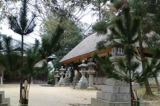 珍しいカヤ葺きの拝殿があります、「大和国山辺郡 夜都伎神社」の論社 春日造桧皮葺、高欄、浜床、向拝…