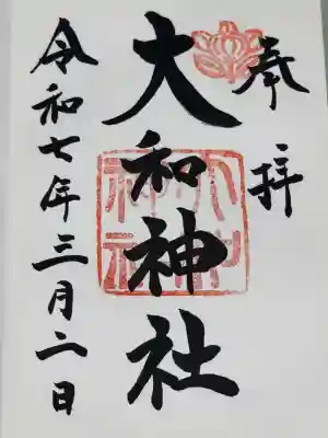 右上に神紋の橘の花の印が押されています。真ん中に「大和神社」と墨書きされ、神社印が重ねられているシンプルなデザインの御朱印を拝受できます。 | |||