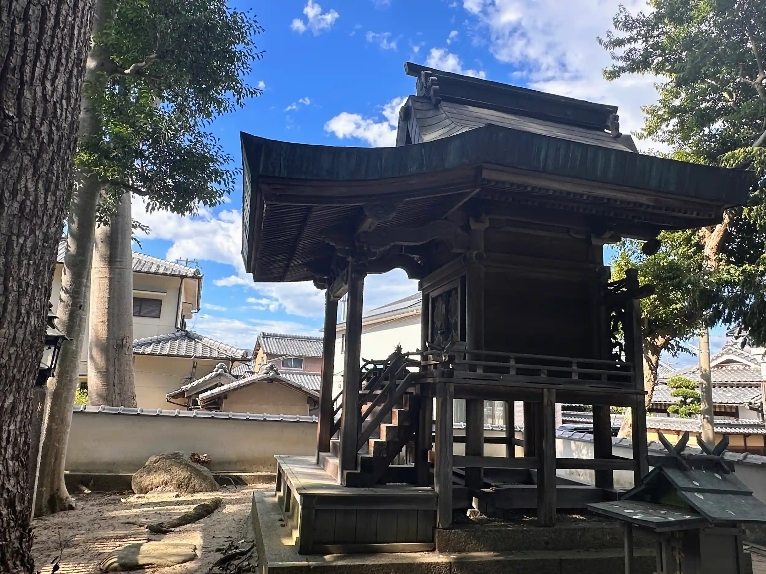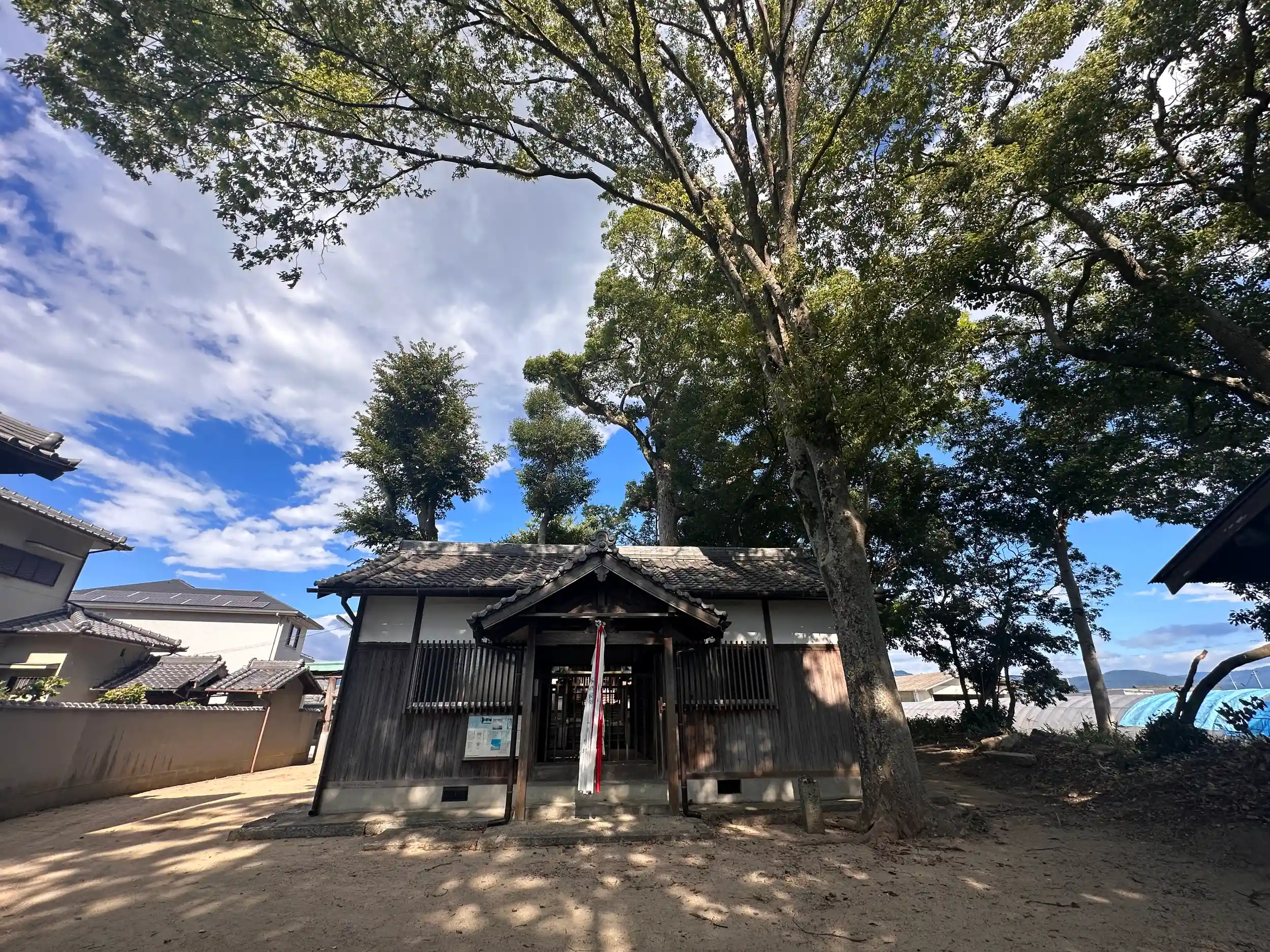 御由緒は分かりません、境内はそんなに広くはありませんが綺麗に整理されています。瑞垣の間より神殿は見ることができます、数少ない巨樹が、熱い日差しを遮ってくれます、道が狭いので集落入口より徒歩での参拝が良いでしょう