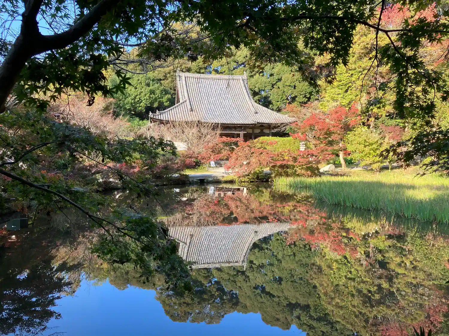 池に映る紅葉と…