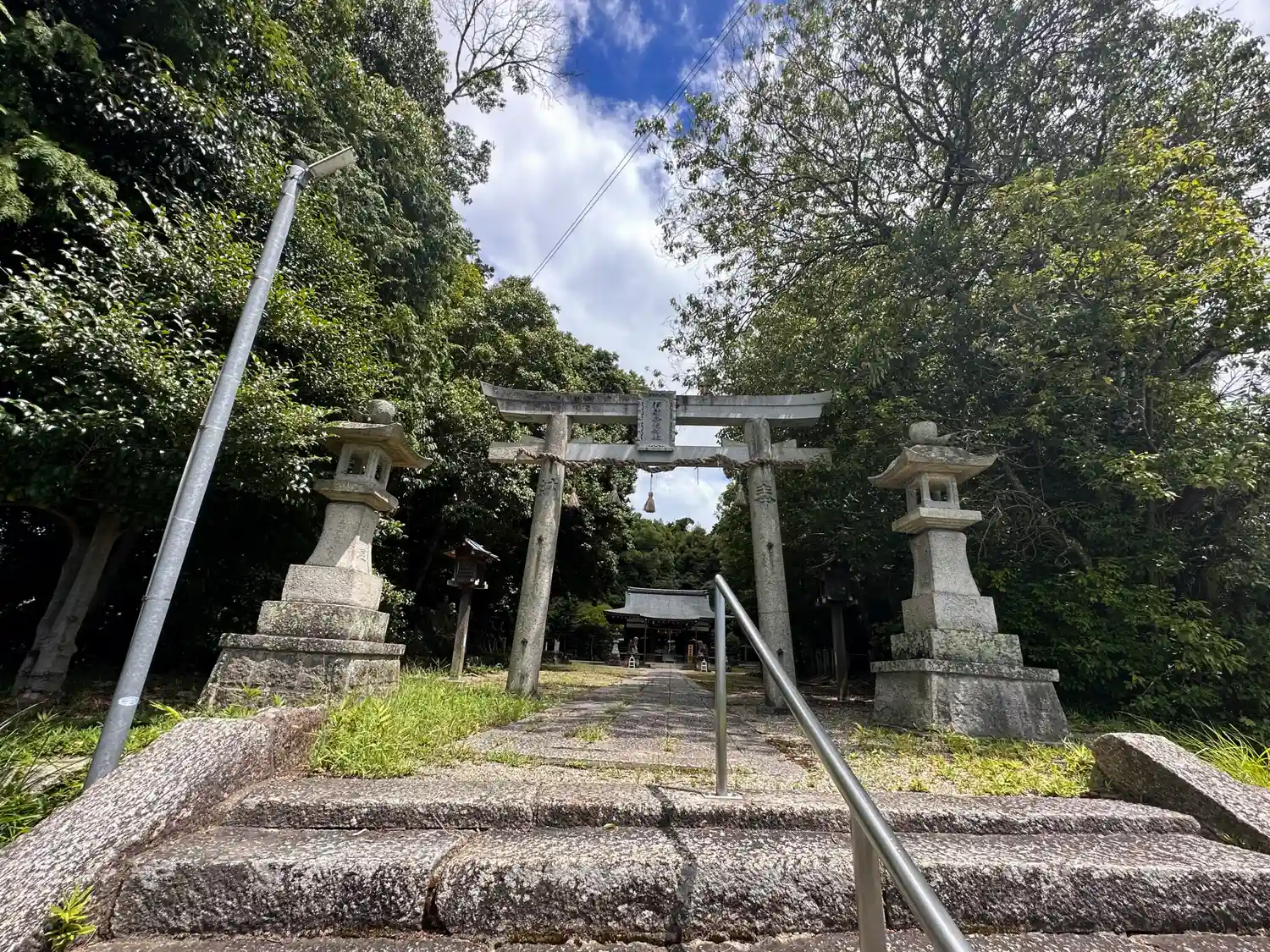 橿原まで走った後の帰り道に巡り会った神社です。鬱蒼とした林の向こうに社殿が見えます。蚊に刺されるの…