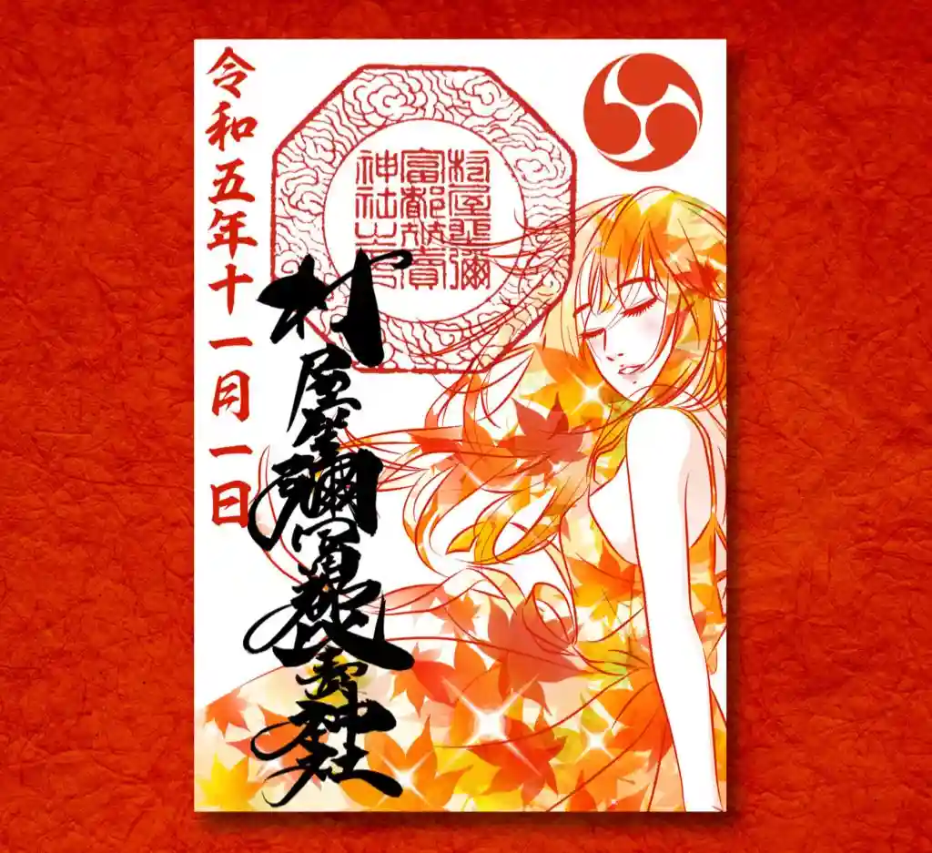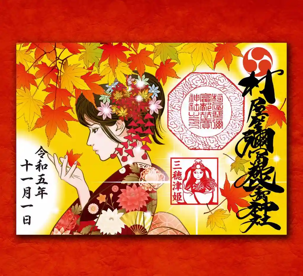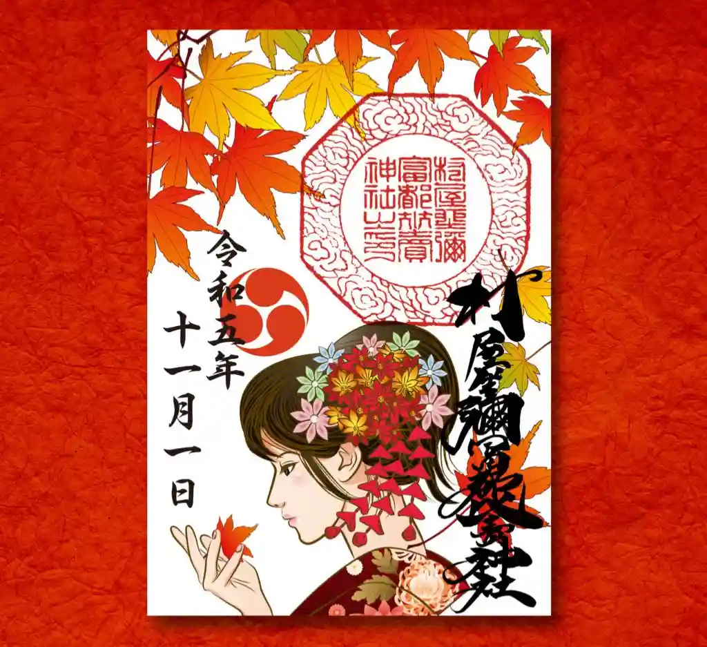 紅葉と和服女性の御朱印
