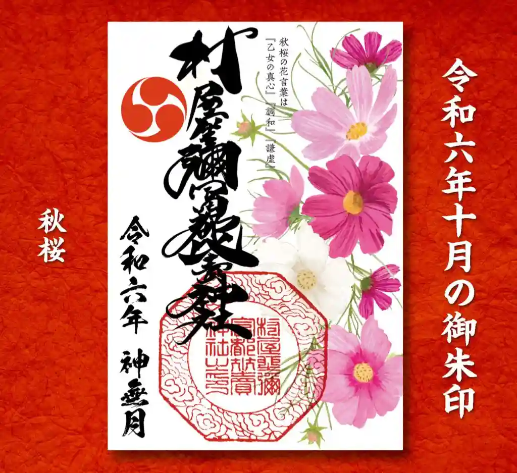 秋の稔りに感謝、金木犀と神楽巫女、秋桜、紅葉などの書き置き御朱印と、直書き御朱印も社務所で対応致しております。
