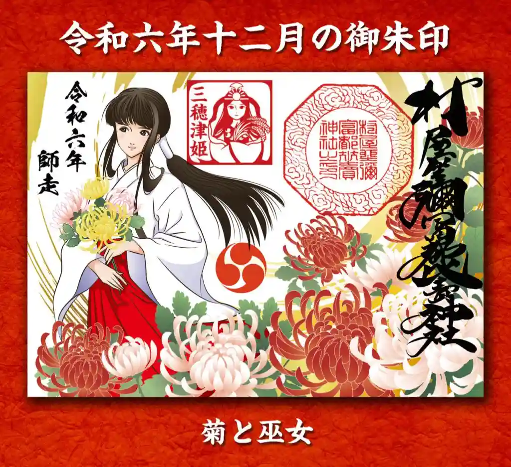 巫女と菊、流鏑馬、巫女の落葉掃除、落ち葉と秋田犬、シクラメンの御朱印と、他に定番の直書き御朱印も対応させていただいております。