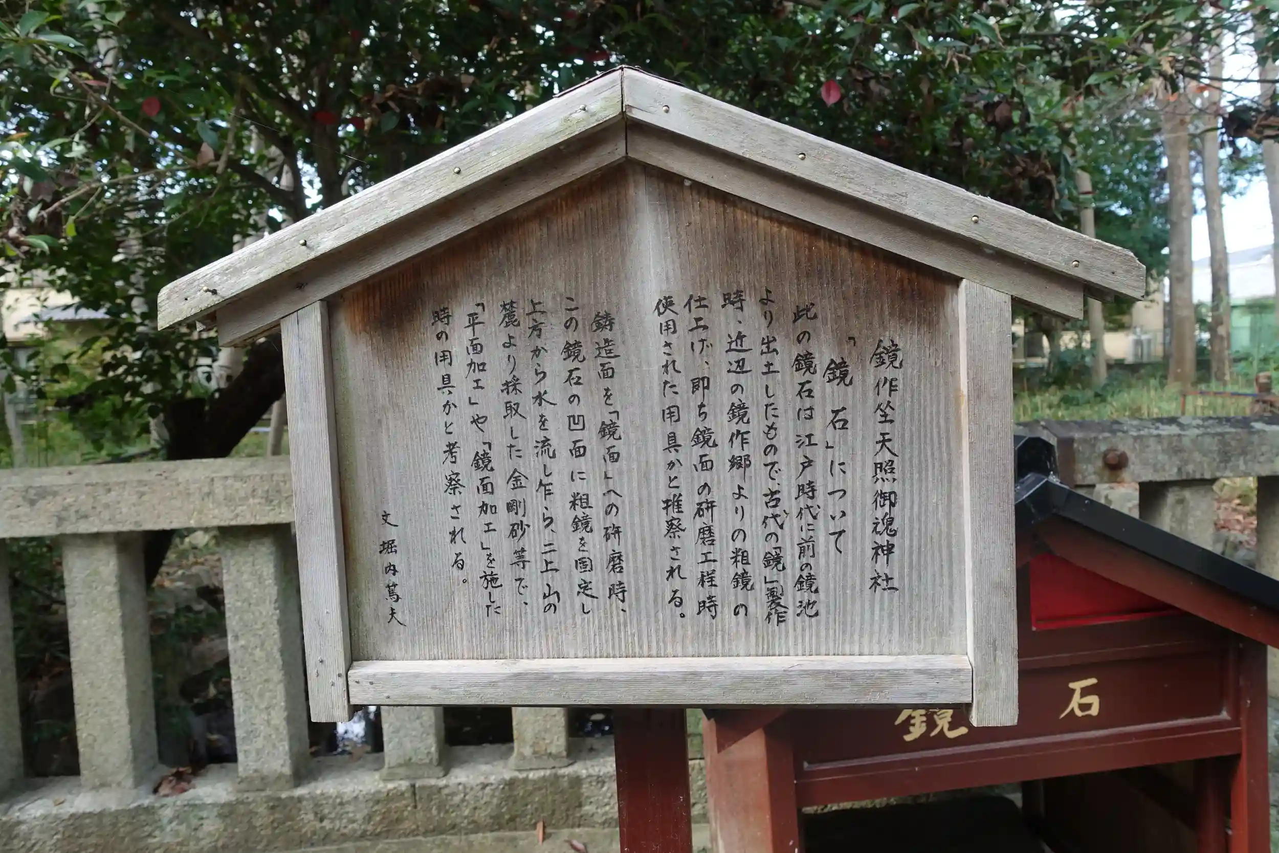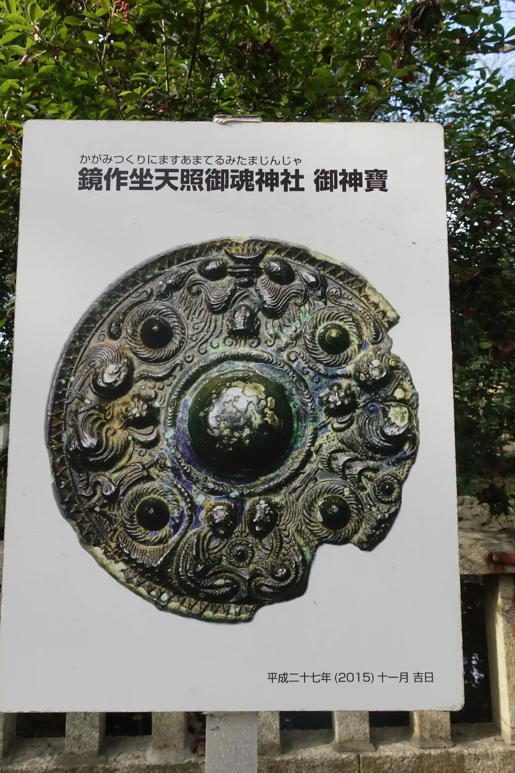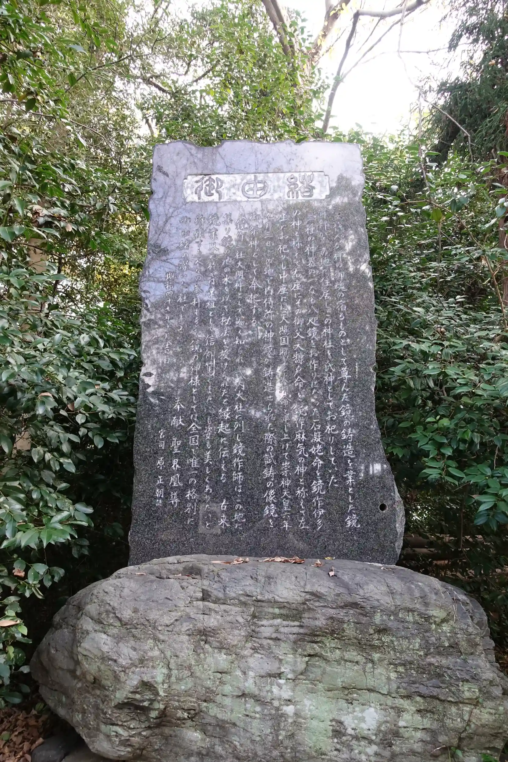 第10代崇神天皇が皇居内で祀られていた天照大神(八咫鏡)を畏れ多いとして笠縫邑の地に遷座させたのち、八咫鏡を作ったとされる石凝姥の子孫である鏡作部が代わりに祀る鏡を作った。