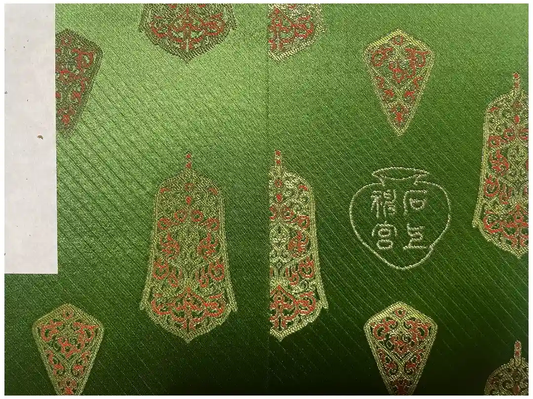 若草色の地に宝物が描かれ、裏面は真ん中に石上神宮の文字と社名を囲むように甕(かめ)が描かれています。